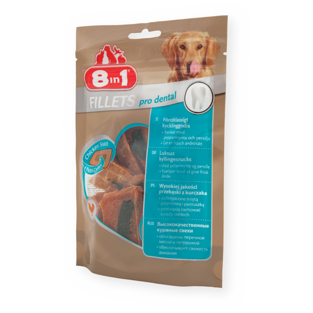 Pochoutky pro zdravé zuby 8in1 Fillets Pro Dental jsou prvotřídní lahodné dobroty pro vašeho psa, které navíc udržují svěží dech. Pochoutky 8in1 Fillets Pro jsou nejen chutné a s nízkým obsahem tuku, ale také vašemu psovi nabídnou lahodnou pochoutku s malým překvapením. Tyto dobroty jsou plné lahodného kuřecího masa se speciálním výživným jádrem, které obsahuje zdravé a funkčními přidané složky přispívající k pohodě a vitalitě vašeho psa. Jedinečné výživné jádro je obohaceno o mátu a semínka petržele. Tyto suroviny se tradičně používají a jsou známé tím, že přispívají ke svěžímu dechu. Pochoutky 8in1 Fillets Pro Dental obsahují pouze 4,5 % tuku a jsou zdravou odměnou mezi krmením. Díky uzavíratelnému sáčku jsou tyto pochoutky ideální pro procházky venku nebo při cestování. Pochoutky 8in1 Fillets jsou také dostupné v několika dalších variantách: Pro Active pro zdravou vitalitu, Pro Digest pro zdravé zažívání, Pro Skin & Coat pro zdravou kůži a srst na míru potřebám každého psa.