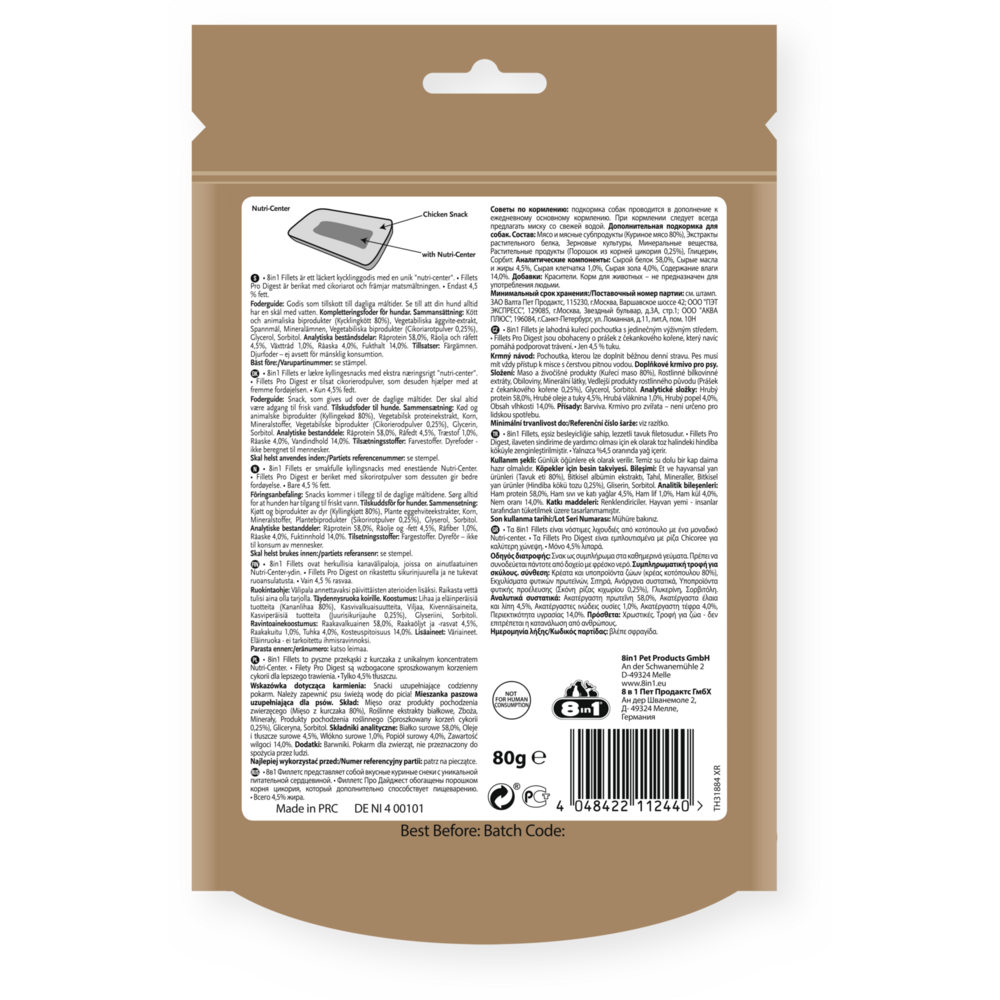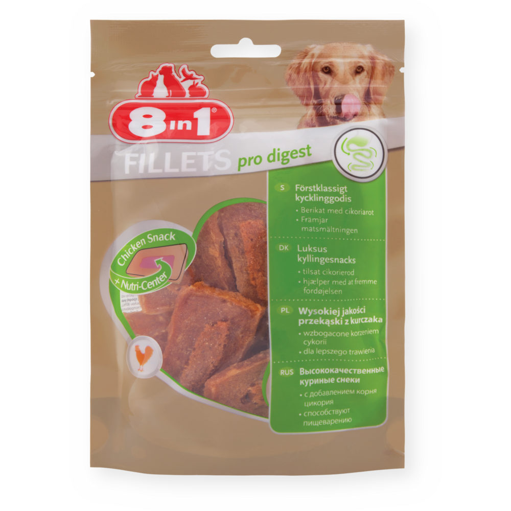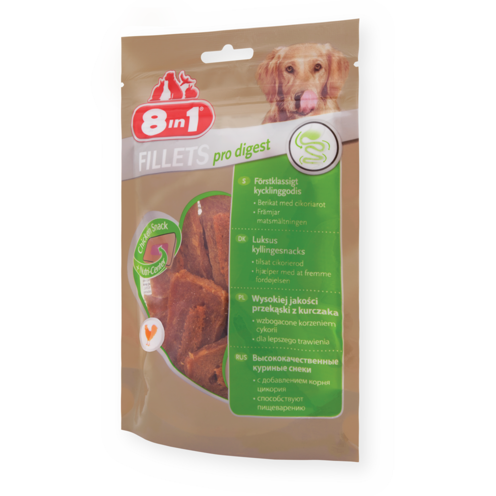 Pochoutky 8in1 Fillets Pro Digest jsou prvotřídní lahodné dobroty pro vašeho psa, které navíc napomáhají zdravému zažívání. Pochoutky 8in1 Fillets Pro jsou nejen chutné a s nízkým obsahem tuku, ale také vašemu psovi nabídnou lahodnou pochoutku s malým překvapením. Tyto dobroty jsou plné lahodného kuřecího masa se speciálním výživným jádrem, které obsahuje zdravé a funkčními přidané složky přispívající k pohodě a vitalitě vašeho psa. Jedinečné výživné jádro obsahuje čekankový kořen, který vašemu psovi poskytuje cenný prebiotický inulin pro vitální střevní mikroflóru. Pochoutky 8in1 Fillets Pro Digest obsahují pouze 4,5 % tuku a jsou zdravou odměnou mezi krmením. Díky uzavíratelnému sáčku jsou tyto pochoutky ideální pro procházky venku nebo při cestování. Pochoutky 8in1 Fillets jsou také dostupné v několika dalších variantách: Pro Dental pro zdravé zuby, Pro Active pro zdravou vitalitu, Pro Skin & Coat pro zdravou kůži a srst na míru potřebám každého psa.