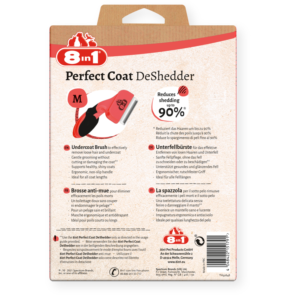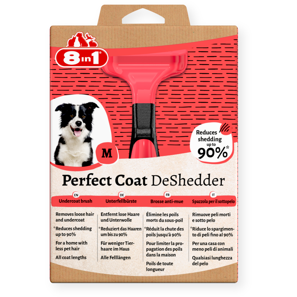 8in1 Perfect Coat DeShedder velikosti M je ideální kartáč na podsadu pro účinnou a jemnou péči o středně velké línající psy. Přispívá k redukci línání až o 90 %. Kartáč jemně odstraňuje uvolněné chlupy, čímž napomáhá dobře udržované, zdravé srsti. Díky ergonomické, protiskluzové rukojeti se 8in1 Perfect Coat DeShedder při péči snadno používá a je nepravděpodobné, že vám vyklouzne z ruky.