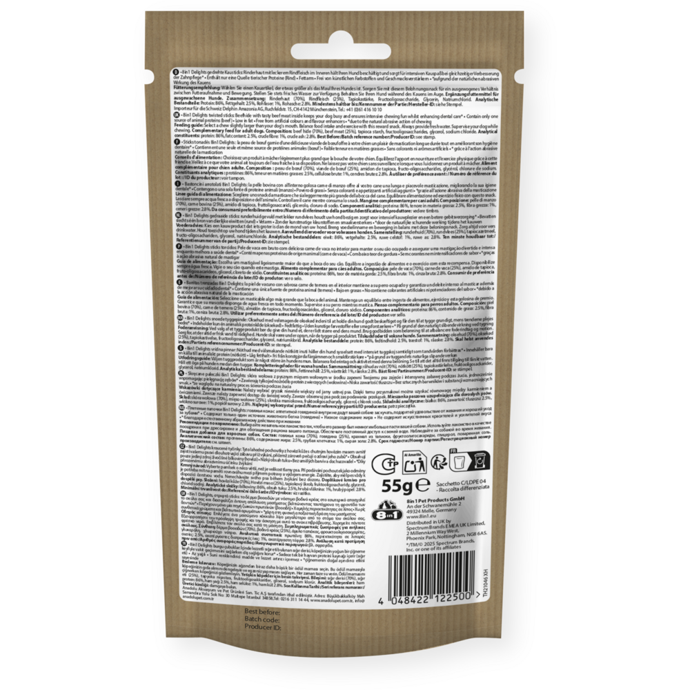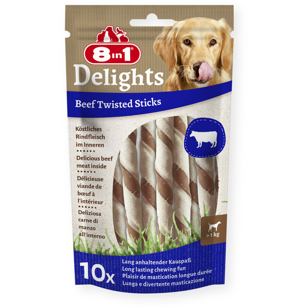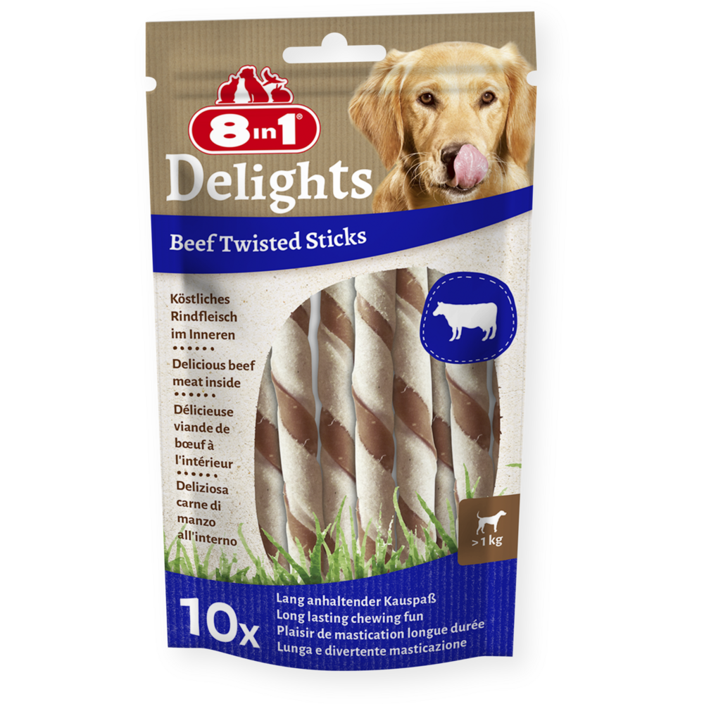 8in1 Delights hovězí kroucené tyčinky jsou vyrobeny z chutné hovězí kůže a lahodného hovězího masa. Zajišťují intenzivní, dlouhotrvající potěšení ze žvýkání pro vašeho psa. A co víc: kroucené tyčinky psa zaměstnají a zároveň zlepšují péči o zuby. Díky přirozenému obrušování při žvýkání se ze zubů odstraňuje zubní kámen a kroucené tyčinky tak podporují zdraví zubů vašeho psa. 8in1 Delights hovězí kroucené tyčinky s nízkým obsahem tuku dokonale poslouží jako lahodná žvýkací pochoutka, kterou svého psa odměníte. Jsou bohaté na proteiny a bez umělých barviv a dochucovadel. Do žvýkacích pochoutek pečených v troubě se navíc nepřidává cukr, GMO, lepek a obiloviny.