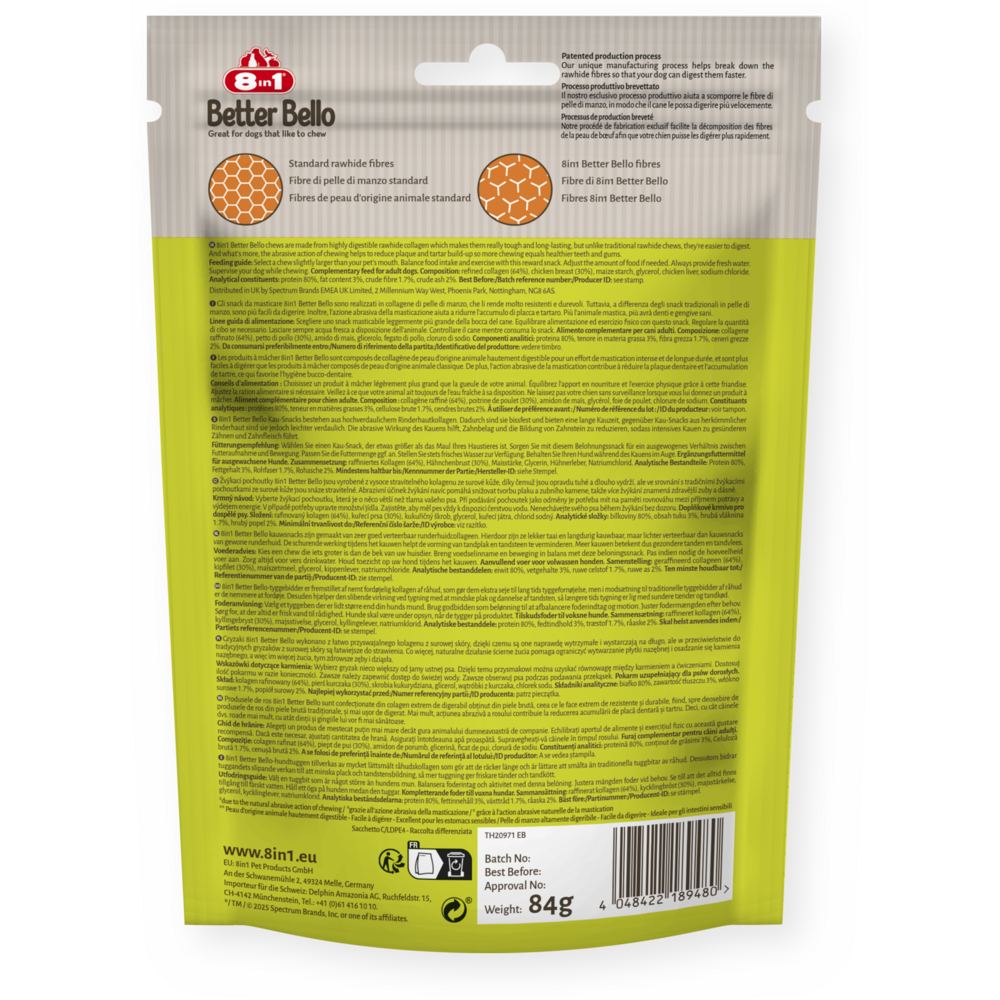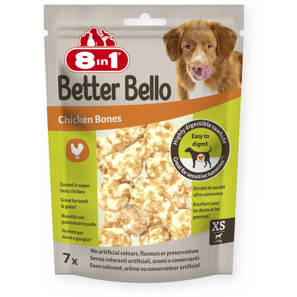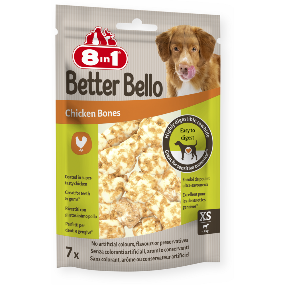 Kuřecí kosti 8v1 Better Bello Chicken Bones XS jsou vyrobené z vysoce stravitelného kolagenu ze surové kůže. Díky tomu jsou opravdu odolné a dlouho vydrží, ale na rozdíl od tradičních žvýkacích pochoutek ze surové kůže jsou lépe stravitelné, a proto jsou skvělé pro citlivé zažívání. A co víc, abrazivní účinek žvýkání pomáhá snižovat tvorbu zubního plaku a kamene, takže více žvýkání znamená zdravější zuby a dásně. Jsme hrdí na to, že používáme jen ty nejlepší suroviny a staráme se o to, aby naše pochoutky Chicken Bones XS neobsahovaly žádná umělá barviva, příchutě ani konzervační látky. Díky vysokému obsahu bílkovin a nízkému obsahu tuku nabízejí tyto kosti dlouhotrvající požitek a žvýkání bez pocitu viny. Dopřejte svému chlupatému mazlíčkovi naše zdravé žvýkací pochoutky a nechte ho vychutnat si jejich lahodnou chuť.