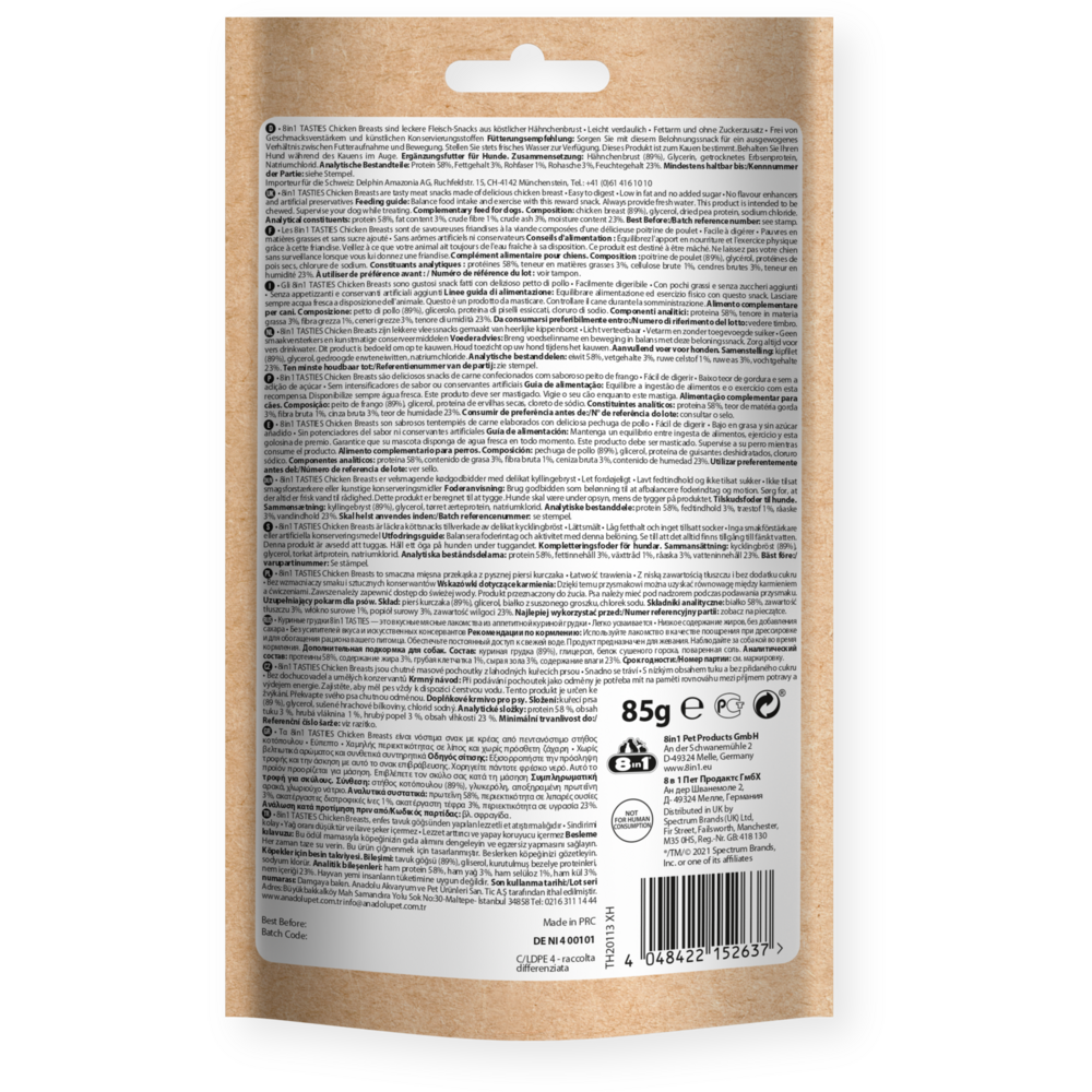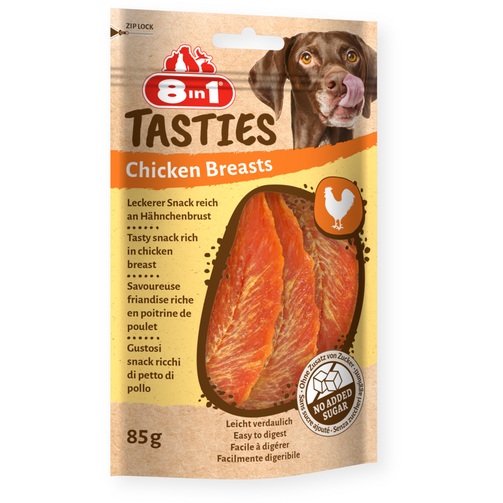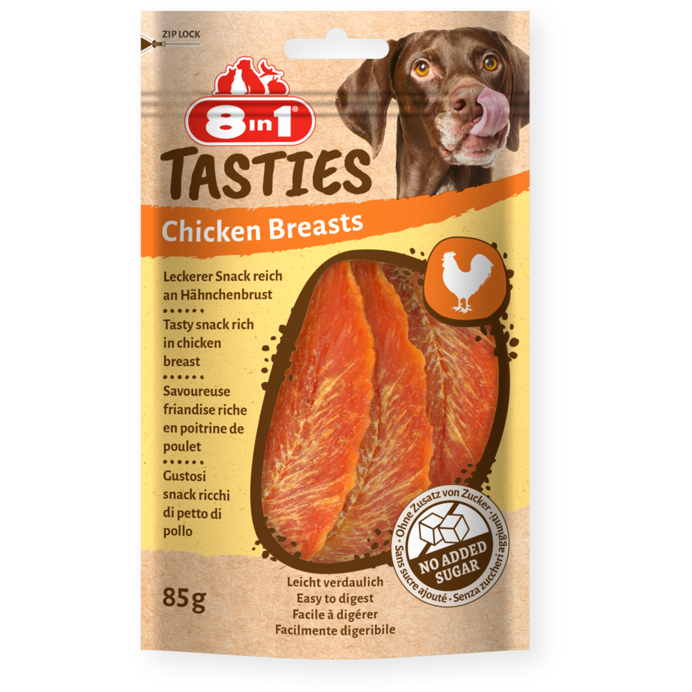 8in1 Chicken Breasts jsou lehce stravitelné, neobsahují přidaný cukr a mají nízký obsah tuku. Jsou vyrobené bez zvýrazňovačů chuti, GMO, umělých konzervačních látek a barviv. Tyto v troubě pečené pamlsky jsou bohaté na bílkoviny a neobsahují lepek. 8in1 Tasties Chicken Breasts jsou ideální pochoutkou pro psy všech velikostí. Nechte svého psa pochutnat si na našich chutných Chicken Breasts!