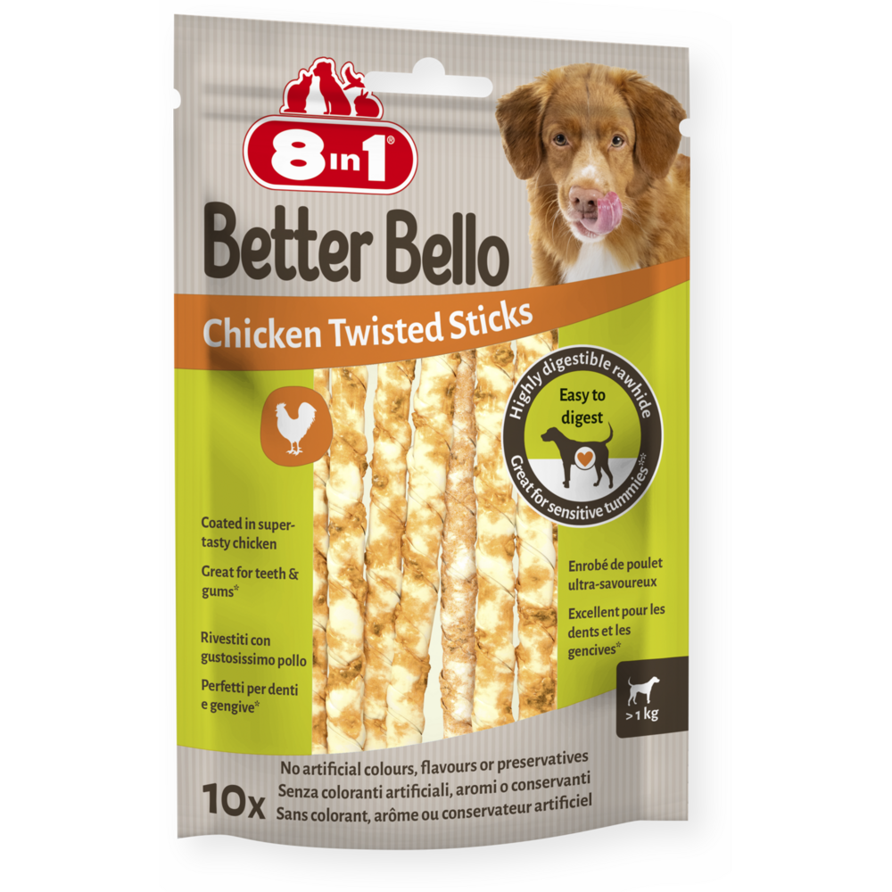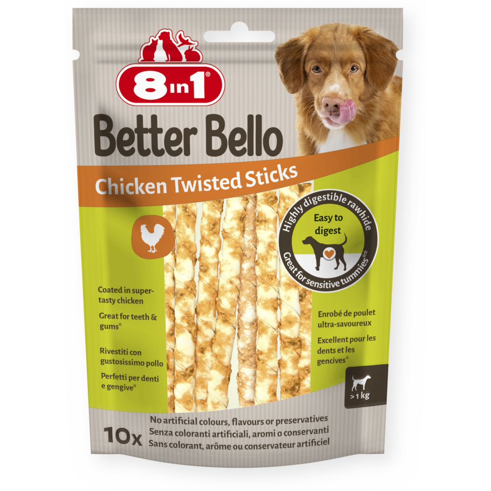 Kuřecí tyčinky 8v1 Better Bello Chicken Sticks jsou vyrobené z vysoce stravitelného kolagenu ze surové kůže. Díky tomu jsou opravdu odolné a dlouho vydrží, ale na rozdíl od tradičních žvýkacích pochoutek ze surové kůže jsou lépe stravitelné, a proto jsou skvělé pro citlivé zažívání. A co víc, abrazivní účinek žvýkání pomáhá snižovat tvorbu zubního plaku a kamene, takže více žvýkání znamená zdravější zuby a dásně. Jsme hrdí na to, že používáme jen ty nejlepší suroviny a že naše tyčinky neobsahují žádná umělá barviva, příchutě ani konzervační látky. Díky vysokému obsahu bílkovin a nízkému obsahu tuku nabízejí tyto tyčinky dlouhotrvající požitek a žvýkání bez výčitek. Dopřejte svému chlupatému mazlíčkovi naše zdravé žvýkací tyčinky a nechte ho vychutnat si jejich lahodnou chuť.