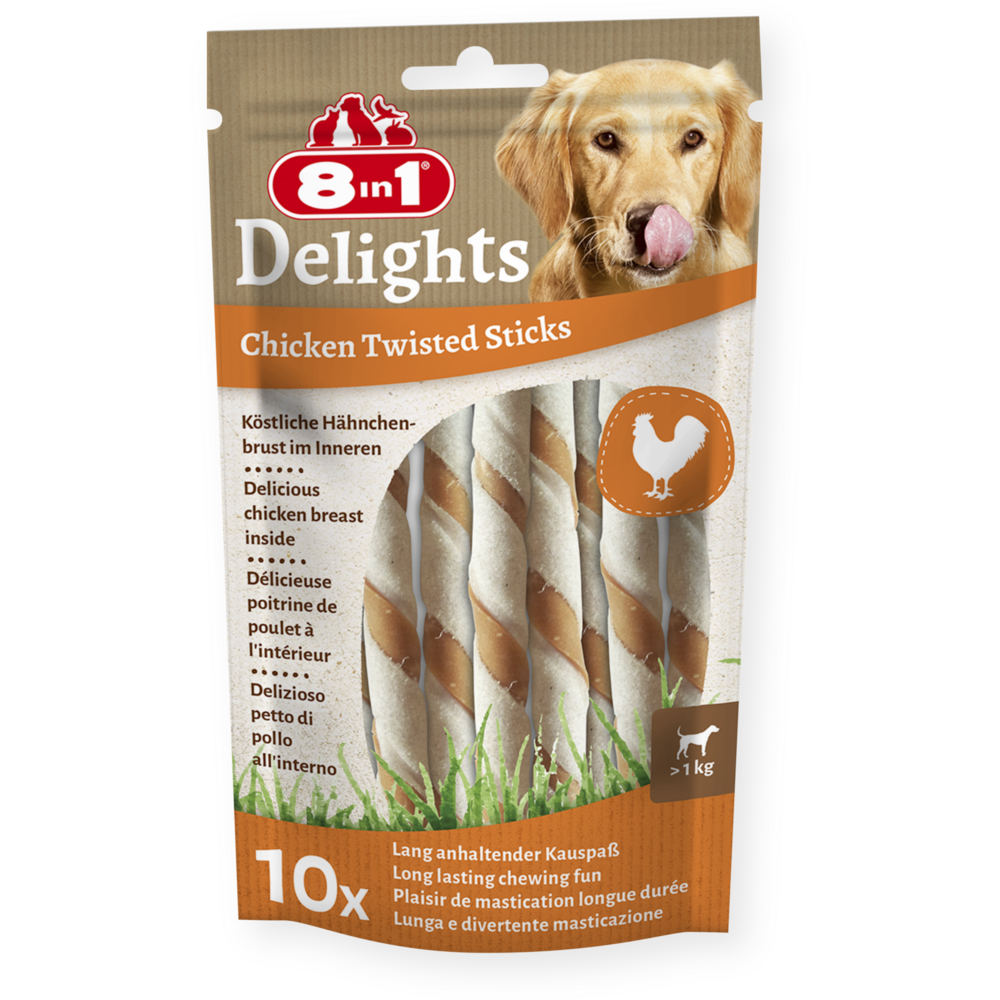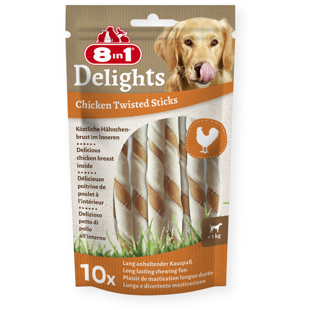 8in1 Delights kuřecí kroucené tyčinky jsou vyrobeny z chutné hovězí kůže a lahodných kuřecích prsou. Zajišťují intenzivní, dlouhotrvající potěšení ze žvýkání pro vašeho psa. A co víc: kroucené tyčinky psa zaměstnají a zároveň zlepšují péči o zuby. Díky přirozenému obrušování při žvýkání se ze zubů psa odstraňuje zubní kámen a kroucené tyčinky tak podporují zdraví zubů vašeho psa. 8in1 Delights kuřecí kroucené tyčinky s nízkým obsahem tuku dokonale poslouží jako lahodná žvýkací pochoutka, kterou svého psa odměníte. Jsou bohaté na proteiny a bez umělých barviv a dochucovadel. Do žvýkacích pochoutek pečených v troubě se navíc nepřidává cukr, GMO, lepek a obiloviny.