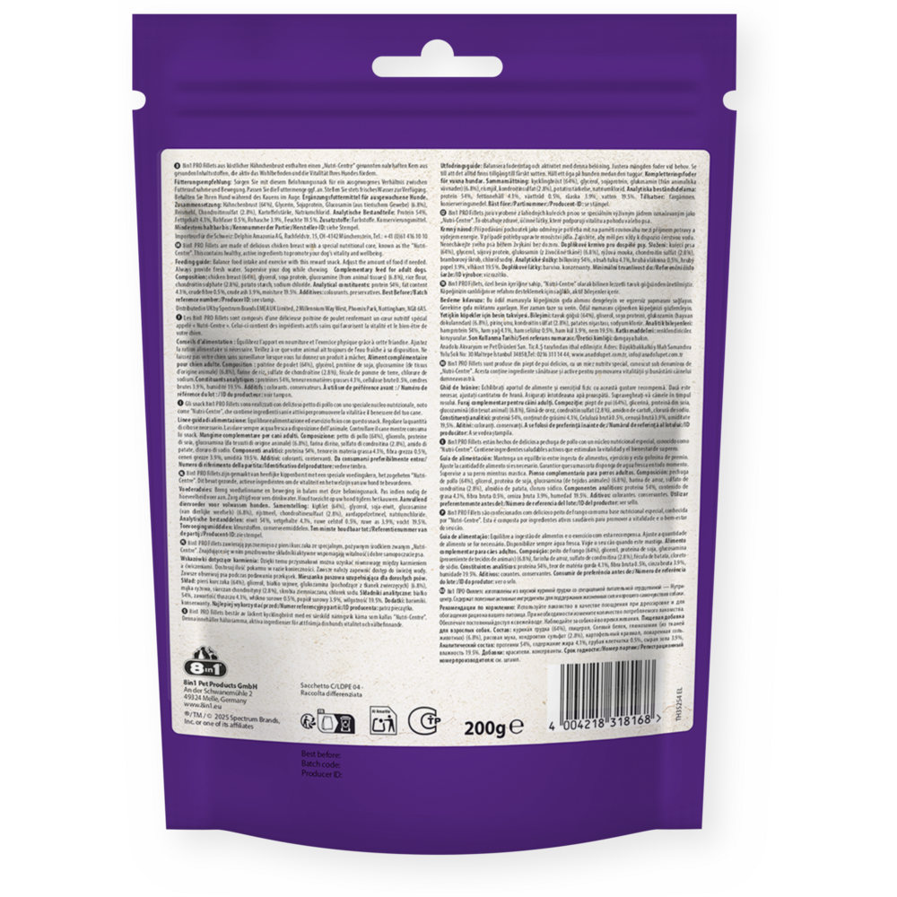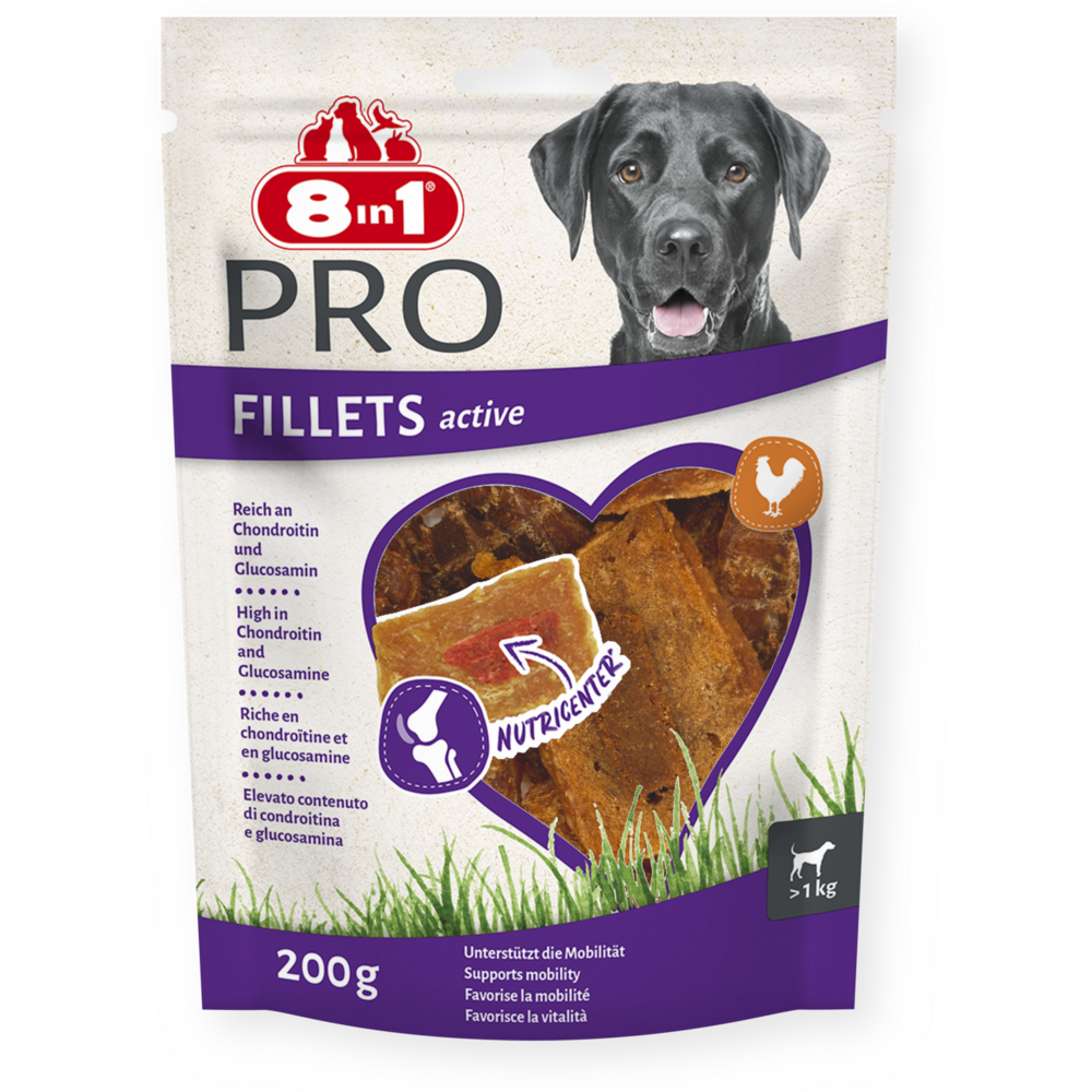 Pamlsky 8in1 Fillets Pro Active jsou lahodné pamlsky prémiové kvality, které pomáhají udržovat vašeho psa v kondici. Pamlsky 8in1 Fillets Pro nejsou jen mimořádně chutné, ale navíc jsou pro vašeho psa lahodnou pochoutkou s přidanou hodnotou. Skládají se z chutných kuřecích prsou se speciální výživnou náplní Nutri-Centre, která obsahuje zdravé a funkční přidané složky podporující pohodu a vitalitu psa. Jedinečná náplň Nutri-Centre má vysoký obsah chondroitinu a glukosaminu, které pomáhají udržovat zdravé kosti a klouby. 8in1 Fillets Pro Active mají nízký obsah tuku a vysoký obsah bílkovin, takže jsou skvělou zdravou odměnou mezi krmením. Navíc jsou vyrobeny bez umělých dochucovadel a konzervačních látek. Uzavíratelný sáček zajistí delší čerstvost a vy si pamlsky můžete snadno vzít s sebou, když jste na cestách. 8in1 Fillets Pro jsou k dispozici ve třech variantách: Pro Active, Pro Dental a Pro Skin & Coat pro uspokojení potřeb každého psa.