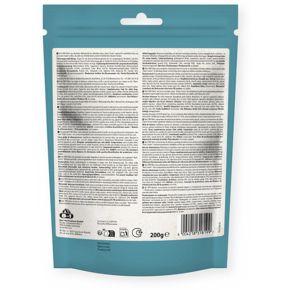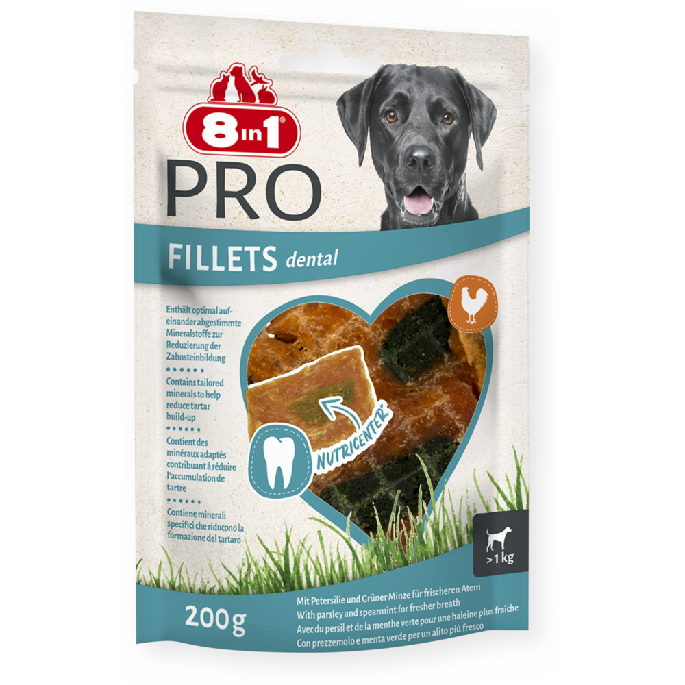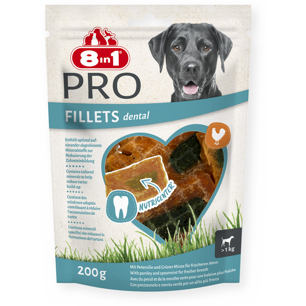 Pamlsky 8in1 Fillets Pro Dental jsou lahodné pamlsky prémiové kvality, které navíc osvěžují dech. Pamlsky 8in1 Fillets Pro nejsou jen mimořádně chutné, ale navíc jsou pro vašeho psa lahodnou pochoutkou s přidanou hodnotou. Skládají se z chutných kuřecích prsou se speciální výživnou náplní Nutri-Centre, která obsahuje zdravé a funkční přidané složky podporující pohodu a vitalitu psa. Jedinečná náplň Nutri-Centre obsahuje speciálně přizpůsobené minerály, které omezují tvorbu zubního kamene, a je obohacena o petržel a mátu peprnou pro svěžejší dech. 8in1 Fillets Pro Dental mají nízký obsah tuku a vysoký obsah bílkovin, takže jsou skvělou zdravou odměnou mezi krmením. Navíc jsou vyrobeny bez umělých dochucovadel a konzervačních látek. Uzavíratelný sáček zajistí delší čerstvost a vy si pamlsky můžete snadno vzít s sebou, když jste na cestách. 8in1 Fillets Pro jsou k dispozici ve třech variantách: Pro Dental, Pro Active and Pro Skin & Coat pro uspokojení potřeb každého psa.