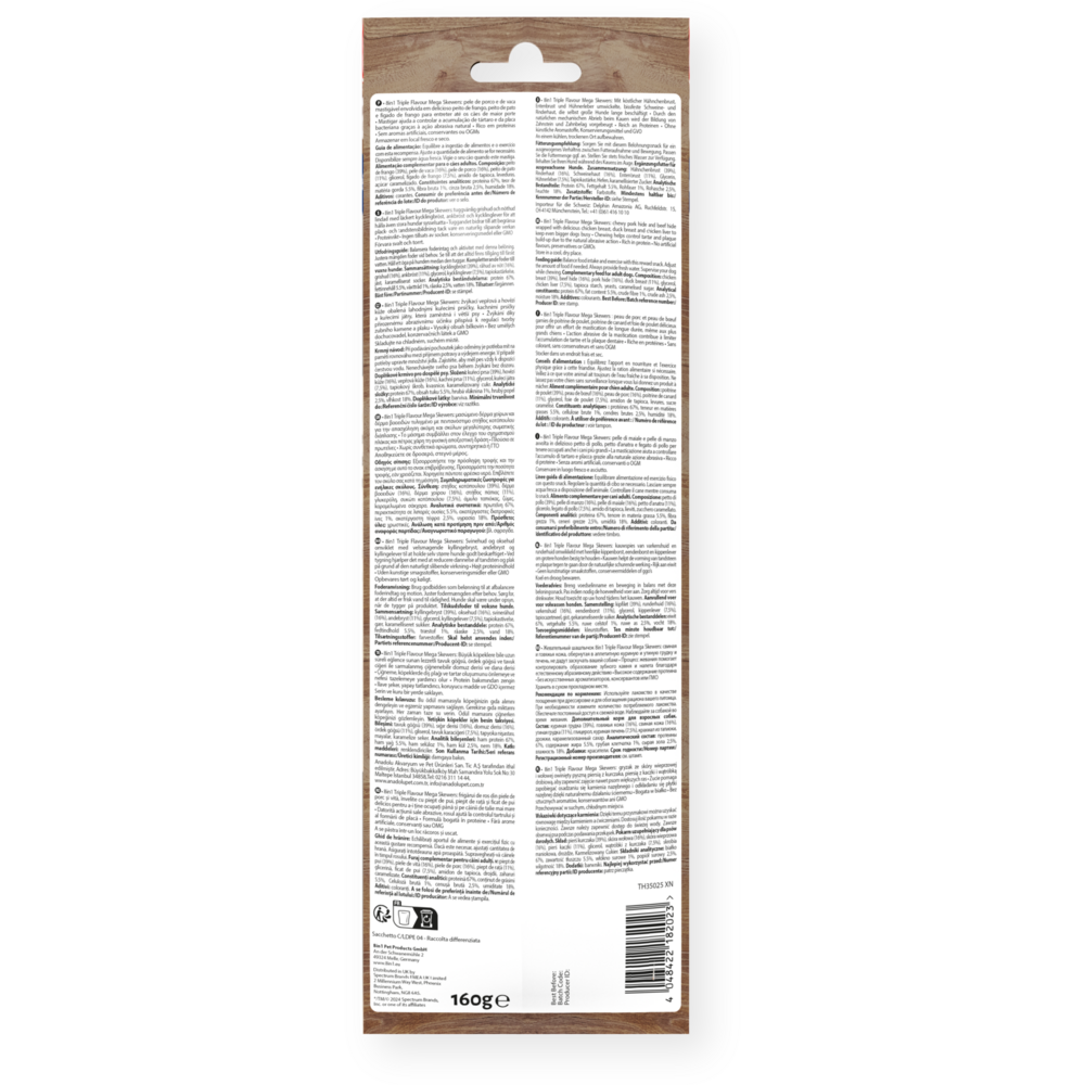 Tyto lahodné pamlsky 8in1 Triple Flavour Mega Skewers jsou větší variantou oblíbených Triple Flavour Skewers a jsou ideální pro delší zabavení větších psů. Žvýkací střed z vepřové a hovězí kůže je obalený chutnými kuřecími prsíčky, kachními prsíčky a kuřecími játry a vytváří tak lahodnou pochoutku pro psy. Tato mimořádně chutná žvýkací pochoutka dlouho vydrží a zaměstná i větší psy. Navíc je skvělá na zuby a dásně, protože přirozený abrazivní účinek žvýkání pomáhá regulovat tvorbu zubního kamene a plaku. Tyto lahodné pamlsky Mega Skewers jsou bohaté na bílkoviny a kombinují 5 chutných masových příchutí, které psi milují. 8in1 Triple Flavour Mega Skewers neobsahují žádné umělé příchutě, konzervační látky ani GMO.