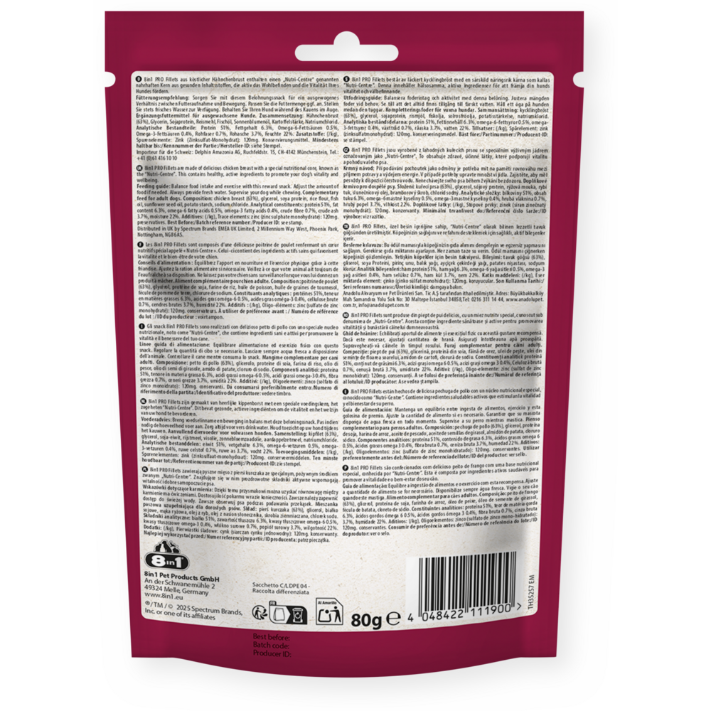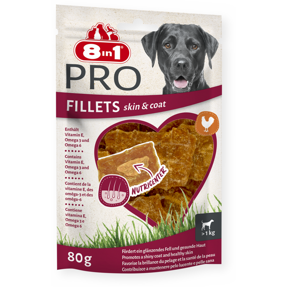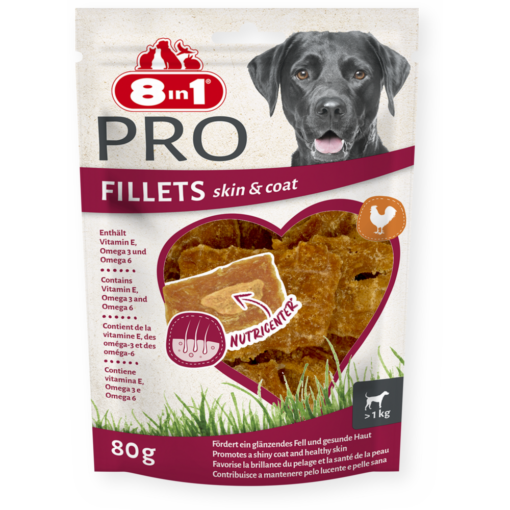 8in1 Fillets Pro Skin & Coat Leckerlis sind hochwertige, köstliche Snacks, die dazu beitragen können, dass Ihr Hund immer wundervoll aussieht. 8in1 Fillets Pro Leckerlis sind nicht nur äußerst schmackhaft und fettarm, sondern bieten Ihrem Hund auch eine besondere Belohnung mit dem gewissen Extra. Diese Leckerlis bestehen aus leckerer Hähnchenbrust mit einem speziellen Nährstoffkern, dem sogenannten „Nutri-Center“, der gesunde, funktionelle Zusatzstoffe enthält, die das Wohlbefinden und die Vitalität Ihres Hundes fördern. Das einzigartige Nutri-Center ist mit Lachsöl, Sonnenblumenöl, Vitamin E und Zinksulfat angereichert und fördert so ein glänzendes, seidiges Fell. Diese Leckerlis sind besonders vorteilhaft, wenn Ihr Hund unter trockener, schuppiger Haut leidet. 8in1 Fillets Pro Skin & Coat sind fettarm und proteinreich und eignen sich daher hervorragend als gesunde Belohnung für zwischendurch. Der wiederverschließbare Beutel sorgt für langanhaltende Frische und ermöglicht es Ihnen, die Leckerlis bequem für unterwegs mitzunehmen. 8in1 Fillets Pro sind in drei Varianten erhältlich: Pro Skin & Coat, Pro Dental und Pro Active, um den unterschiedlichen Bedürfnissen jedes Hundes gerecht zu werden.