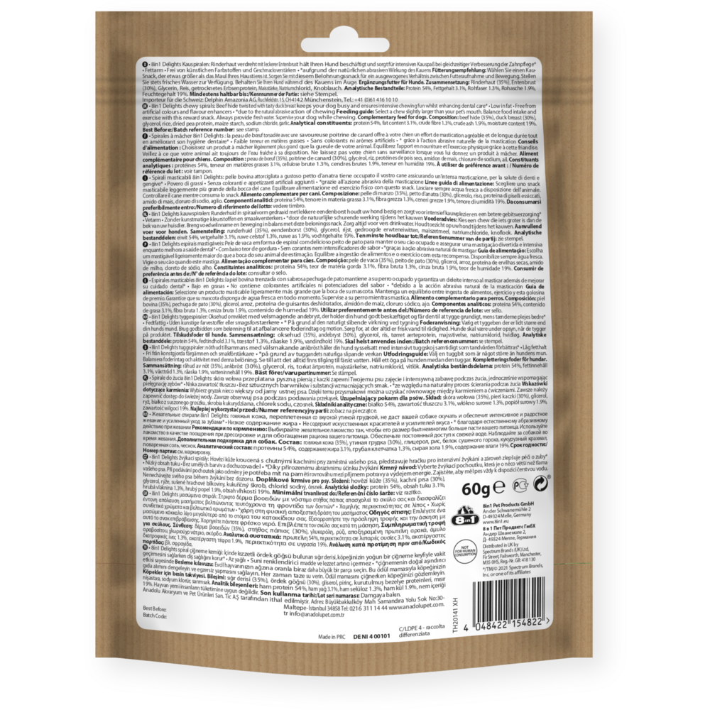 8in1 Delights Duck Spirals bestehen aus schmackhafter Rinderhaut und leckerer Entenbrust. In Form einer Spirale sorgen sie für lang anhaltenden Kauspaß bei Hunden aller Größen. Und nicht nur das: Die Spiralen beschäftigen Ihren Hund nicht nur, sondern fördern auch die Zahnpflege. Durch den natürlichen Abrieb beim Kauen wird Zahnstein von den Zähnen Ihres Hundes entfernt, und auf diese Weise unterstützen die Spiralen die Zahngesundheit Ihres Hundes. Mit den fettarmen 8in1 Delights Duck Spirals können Sie Ihren Hund mit einem im Ofen gebackenen Kauartikel belohnen, der reich an Proteinen und frei von künstlichen Farbstoffen und Geschmacksverstärkern ist. Außerdem sind sie frei von Zucker, GVO und Gluten. Geben Sie Ihrem vierbeinigen Freund etwas Besonderes und belohnen Sie ihn mit unseren 8in1 Delights Duck Spirals