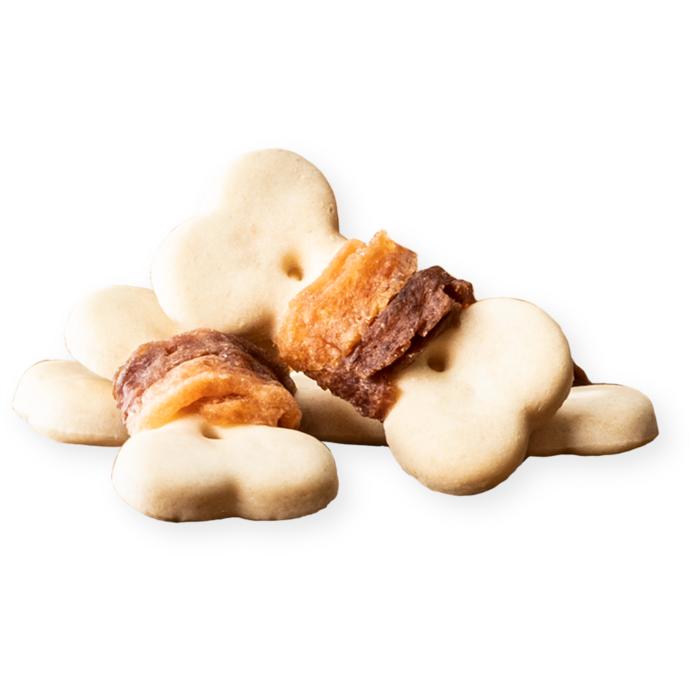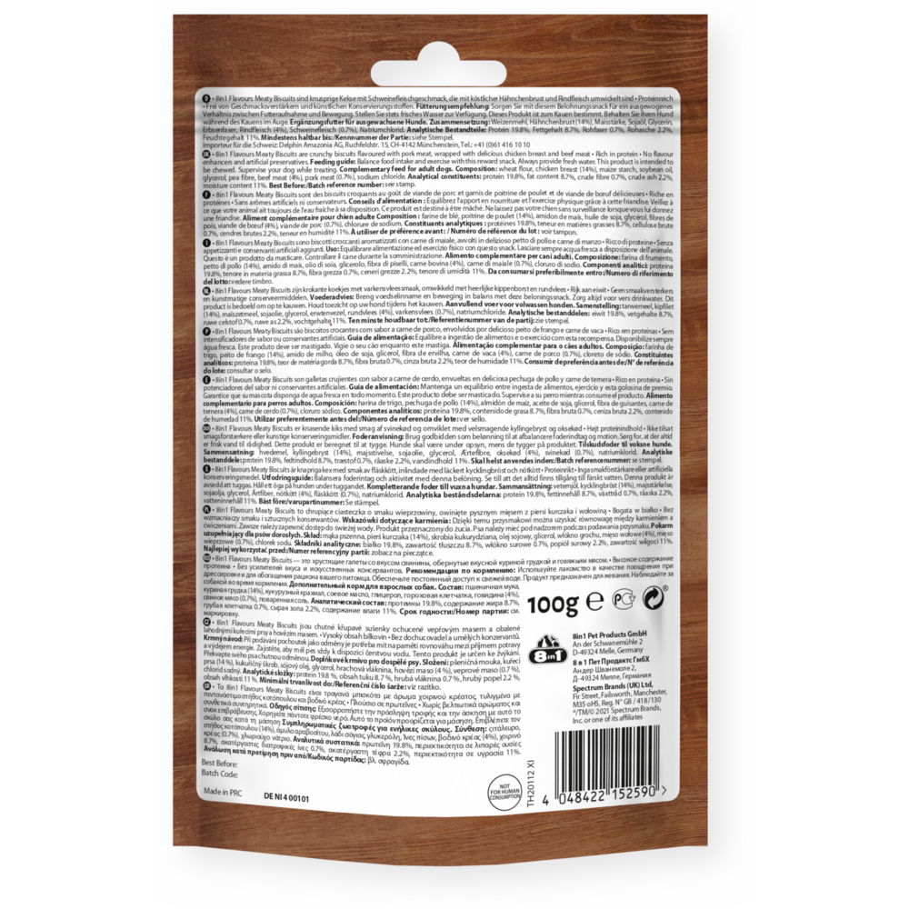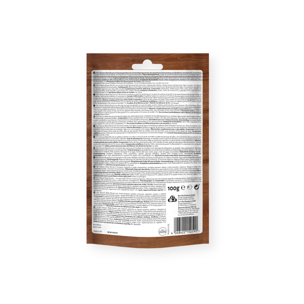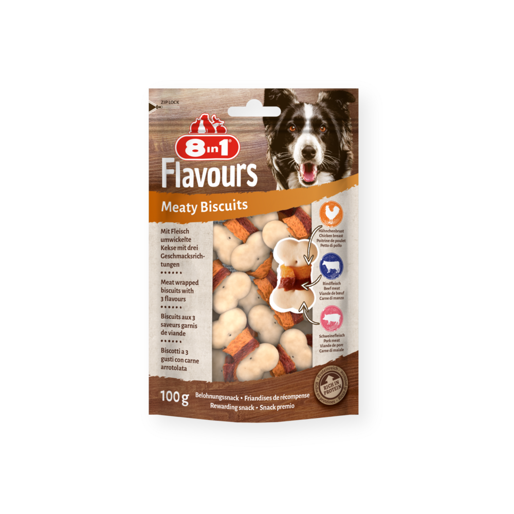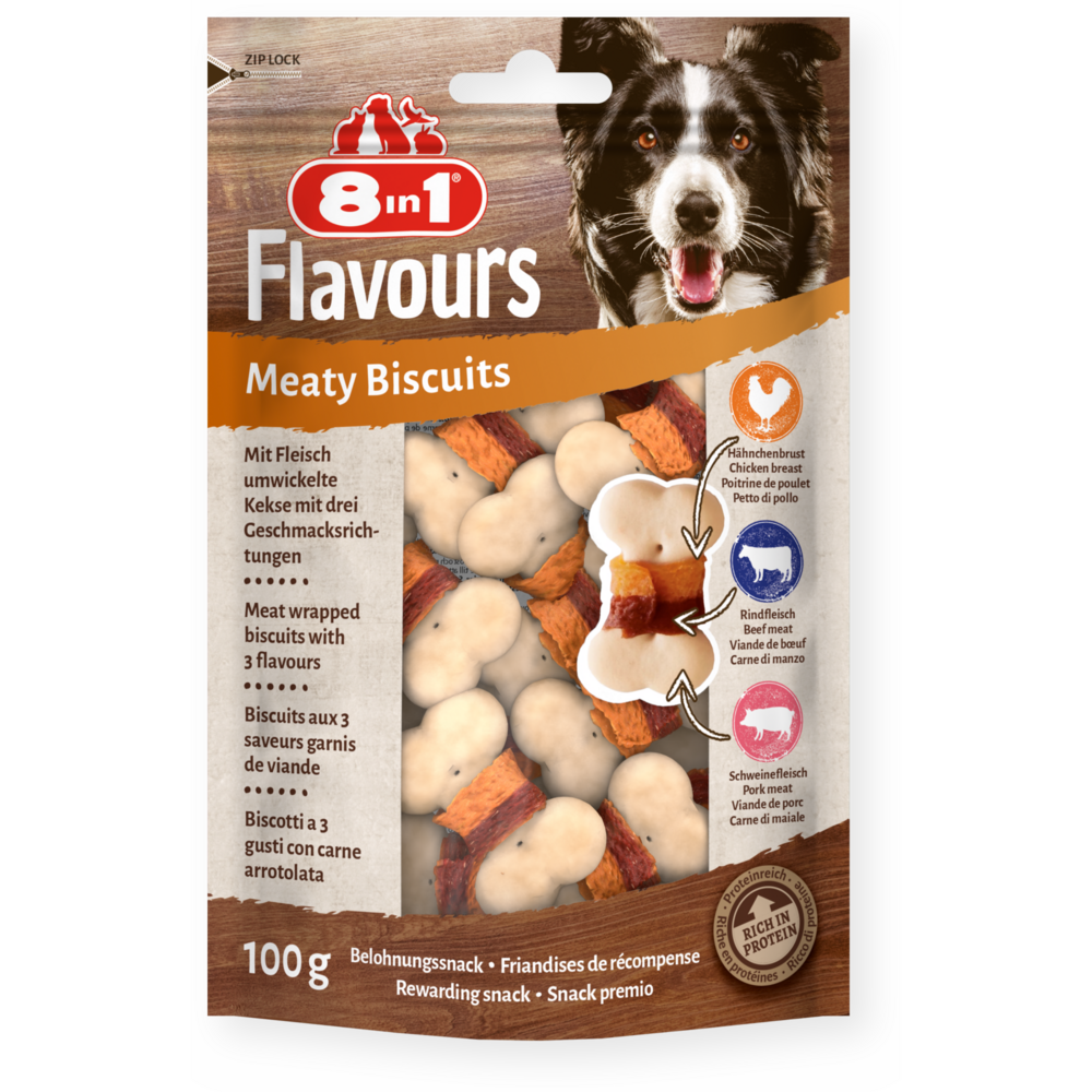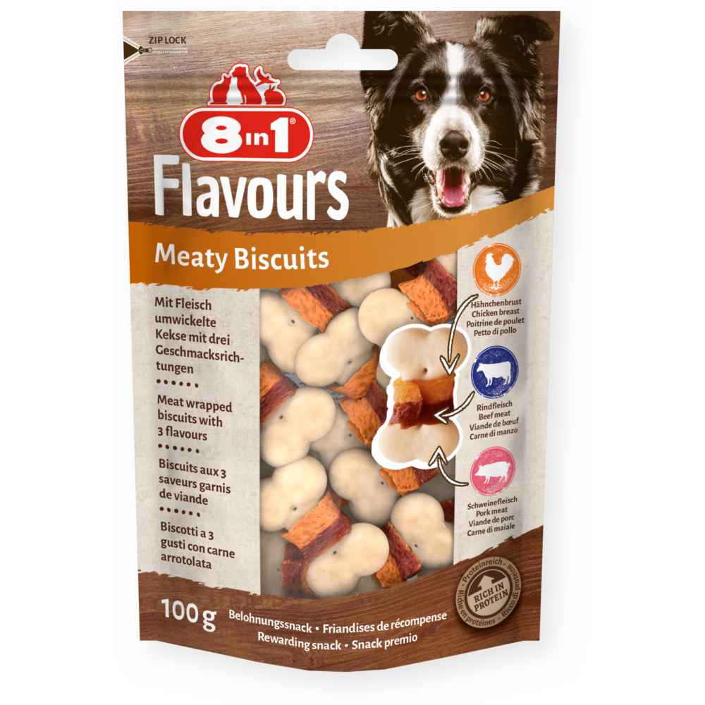 8in1 Flavours Meaty Biscuits sind köstliche Belohnungssnacks, die in ein und demselben Snack drei Geschmacksnoten vereinen! Die knusprigen Kekse aus köstlichem Schweinefleisch sind mit leckerer Hähnchenbrust und Rindfleisch umwickelt. Kein Hund kann ihrem ausgeprägten angenehmen Geschmack widerstehen. Die Kekse sind reich an Proteinen, frei von Geschmacksverstärkern, genetisch veränderten Organismen (GVO) und künstlichen Konservierungsstoffen und werden darüber hinaus im Ofen gegart. Unsere 8in1 Meaty Biscuits sind die perfekten Snacks für Hunde jeder Größe. Mit unseren leckeren Meaty Biscuits machen Sie Ihrem Vierbeiner garantiert eine genüssliche Freude.