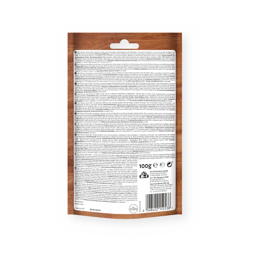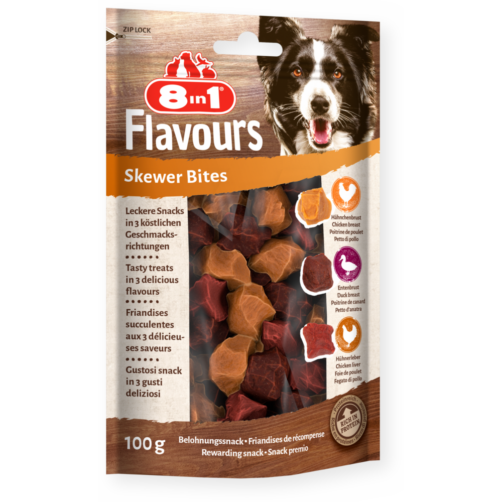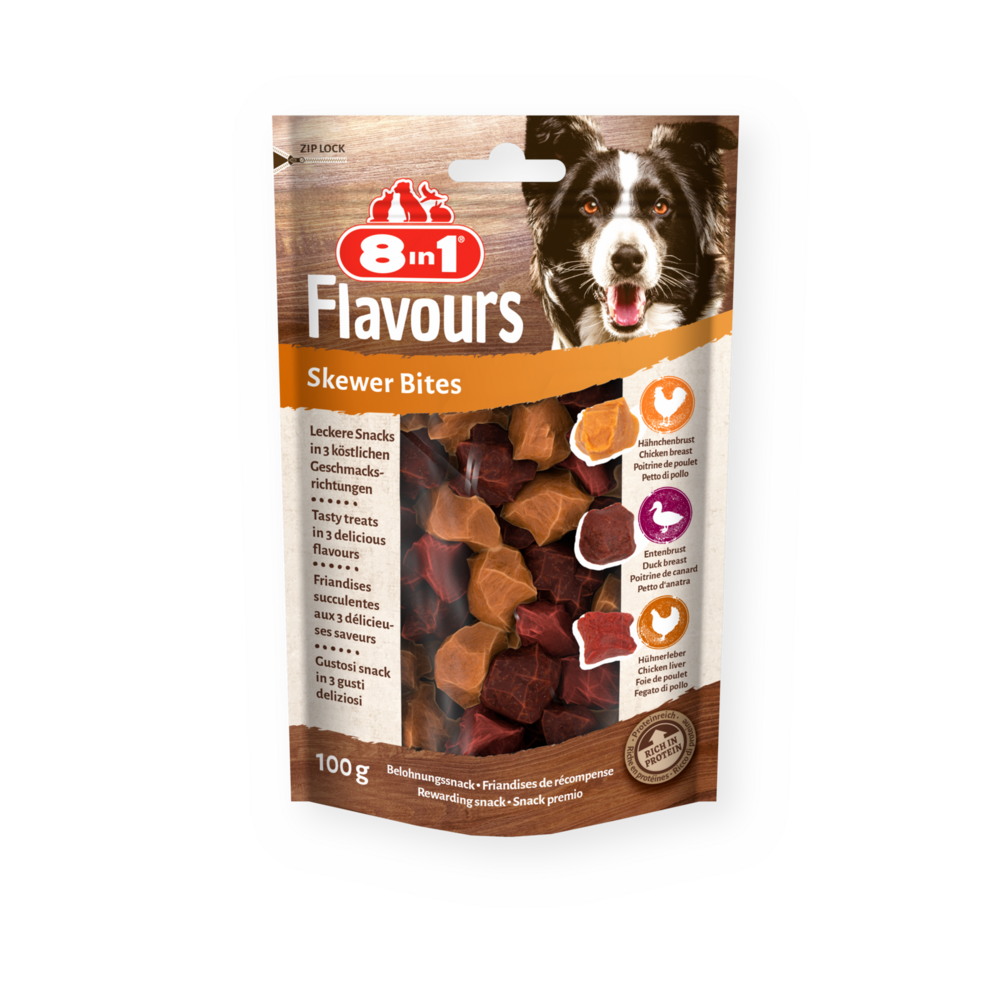 8in1 Flavours Skewer Bites sind schmackhafte Belohnungssnacks in Form von Happen in den drei Geschmacksrichtungen Hähnchenbrust, Entenbrust und Hühnerleber. Die Skewer Bites sind das beste Stück vom Spieß in Form von maulgerechten Happen und der perfekte Snack zur sofortigen Belohnung Ihres Hundes. Die Skewer Bites sind reich an Proteinen und fettarm. Frei von Geschmacksverstärkern, genetisch veränderten Organismen (GVO) und künstlichen Konservierungsstoffen sind sie ein unwiderstehlicher Leckerbissen für Hunde jeder Größe. Hinzu kommt, dass sie im Ofen gegart werden. Verwöhnen Sie Ihren Vierbeiner mit unseren köstlichen Skewer Bites.