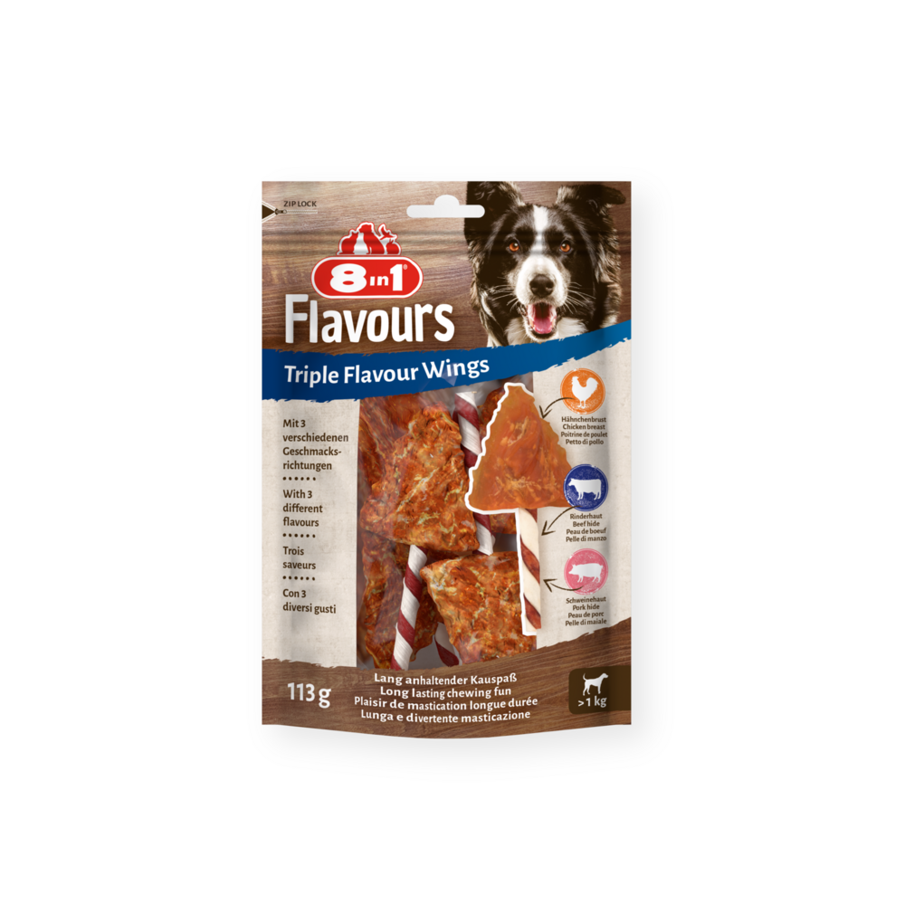 Unsere unglaublich schmackhaften 8in1 Flavours Triple Flavour Wings vereinen drei köstliche Geschmacksrichtungen aus Schweine- und Rinderhaut, umhüllt von köstlicher Hähnchenbrust für ein besonders leckeres Geschmackserlebnis. Diese lang haltenden Kau-Flügel helfen durch ihre natürliche schleifende Wirkung beim Kauen, Zahnstein und Zahnbelag zu bekämpfen. Sie enthalten viel Protein, sind fettarm und frei von Zuckerzusätzen, Geschmacksverstärkern und künstlichen Konservierungsstoffen, so dass sie die ideale Belohnung oder den idealen Snack für Hunde jeder Größe darstellen. Außerdem enthalten sie keine gentechnisch veränderten Organismen und werden sogar im Ofen gebacken, was nicht nur zu ihrer Haltbarkeit beiträgt, sondern auch die wertvollen Nährstoffe erhält. Mit unseren 8in1 Triple Flavour Wings halten Sie Ihren Hund immer bei Laune.