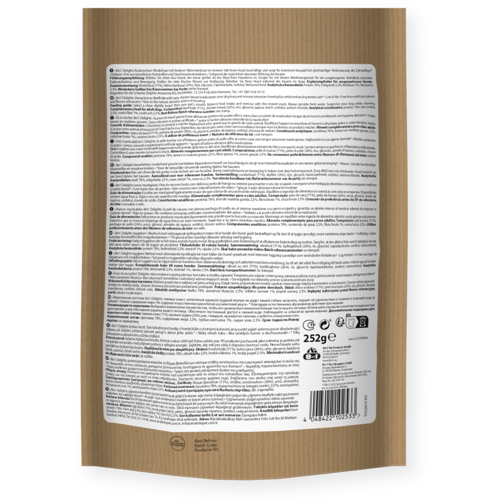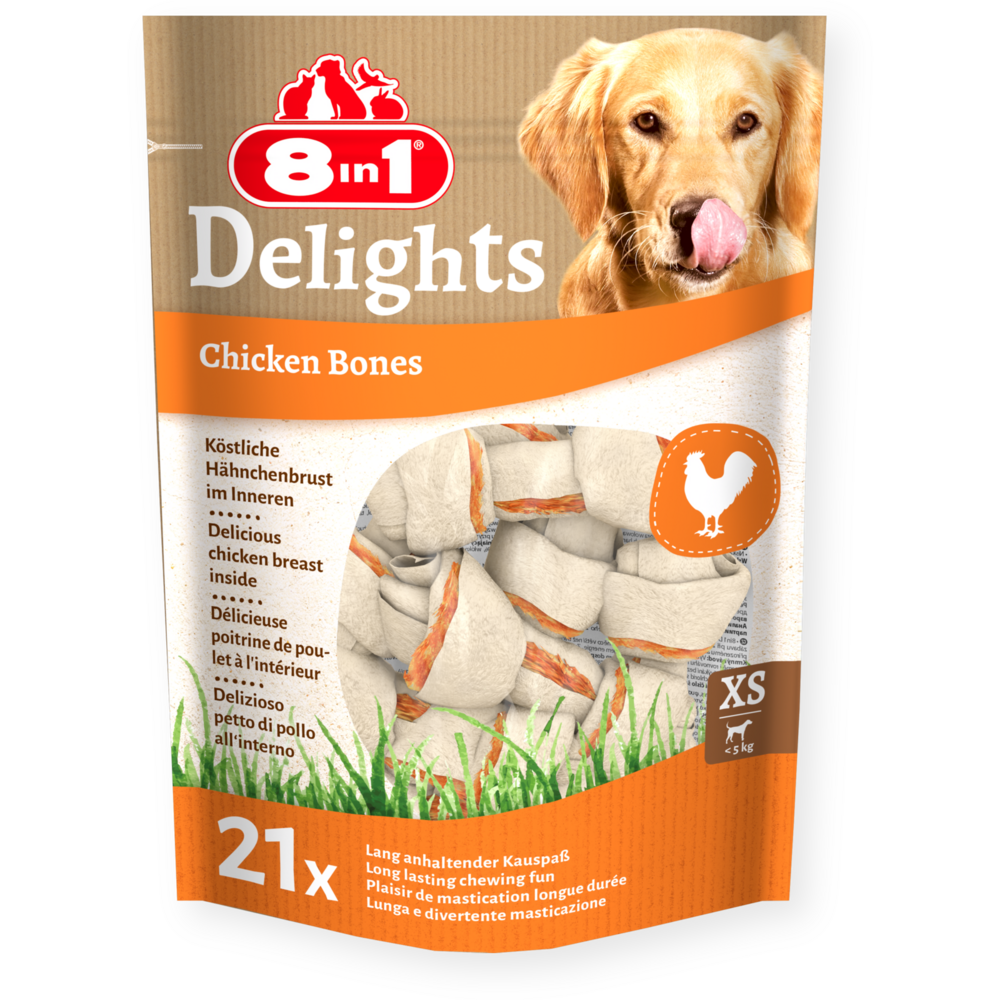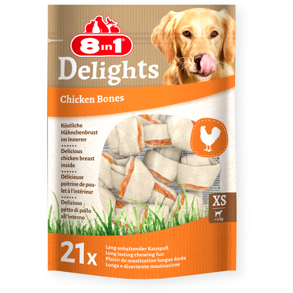 Die optimal auf bis zu 5 kg wiegende Zwerghunde zugeschnittenen 8in1 Delights Chicken Bones XS aus leckerer Rinderhaut und köstlicher Hähnchenbrust stehen für ausgiebigen, lang anhaltenden Kauspaß. Aber nicht nur das: Während die Kauknochen Ihren Hund genüsslich beschäftigen, unterstützen sie gleichzeitig die Zahnpflege. Denn durch den mechanischen Abrieb beim Kauen wird auf natürliche Weise Zahnstein entfernt. Auf diese Weise tragen die Kauknochen zur Zahngesundheit Ihres Hundes bei. Die fettarmen, köstlichen 8in1 Delights Chicken Bones XS eignen sich hervorragend, um Ihren Hund zu belohnen. Die im Ofen gegarten Kauartikel sind reich an Proteinen, frei von künstlichen Farbstoffen und Geschmacksverstärkern und ohne Zusatz von Zucker, GVO und Gluten.