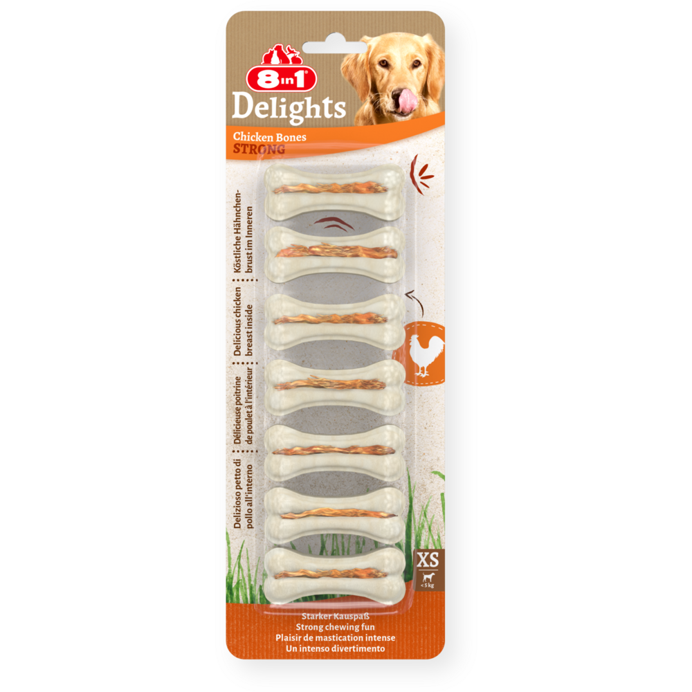 Die optimal auf bis zu 5 kg wiegende Zwerghunde zugeschnittenen extra harten 8in1 Delights Chicken Bones Strong XS aus leckerer Rinderhaut und köstlicher Hähnchenbrust stehen für ausgiebigen, lang anhaltenden Kauspaß. Aufgrund ihrer festen Konsistenz sind die leckeren Kauknochen schwer zu kauen und eignen sich daher perfekt für Hunde mit besonders ausgeprägtem Kauinstinkt. Aber nicht nur das: Während die Kauknochen Ihren Hund genüsslich beschäftigen, unterstützen sie gleichzeitig die Zahnpflege. Denn durch den mechanischen Abrieb beim Kauen wird auf natürliche Weise Zahnstein entfernt. Auf diese Weise tragen die Kauknochen zur Zahngesundheit Ihres Hundes bei. Die fettarmen, köstlichen 8in1 Delights Chicken Bones Strong XS eignen sich hervorragend, um Ihren Hund zu belohnen. Die im Ofen gegarten Kauartikel sind reich an Proteinen, frei von künstlichen Farbstoffen und Geschmacksverstärkern und ohne Zusatz von GVO und Gluten.