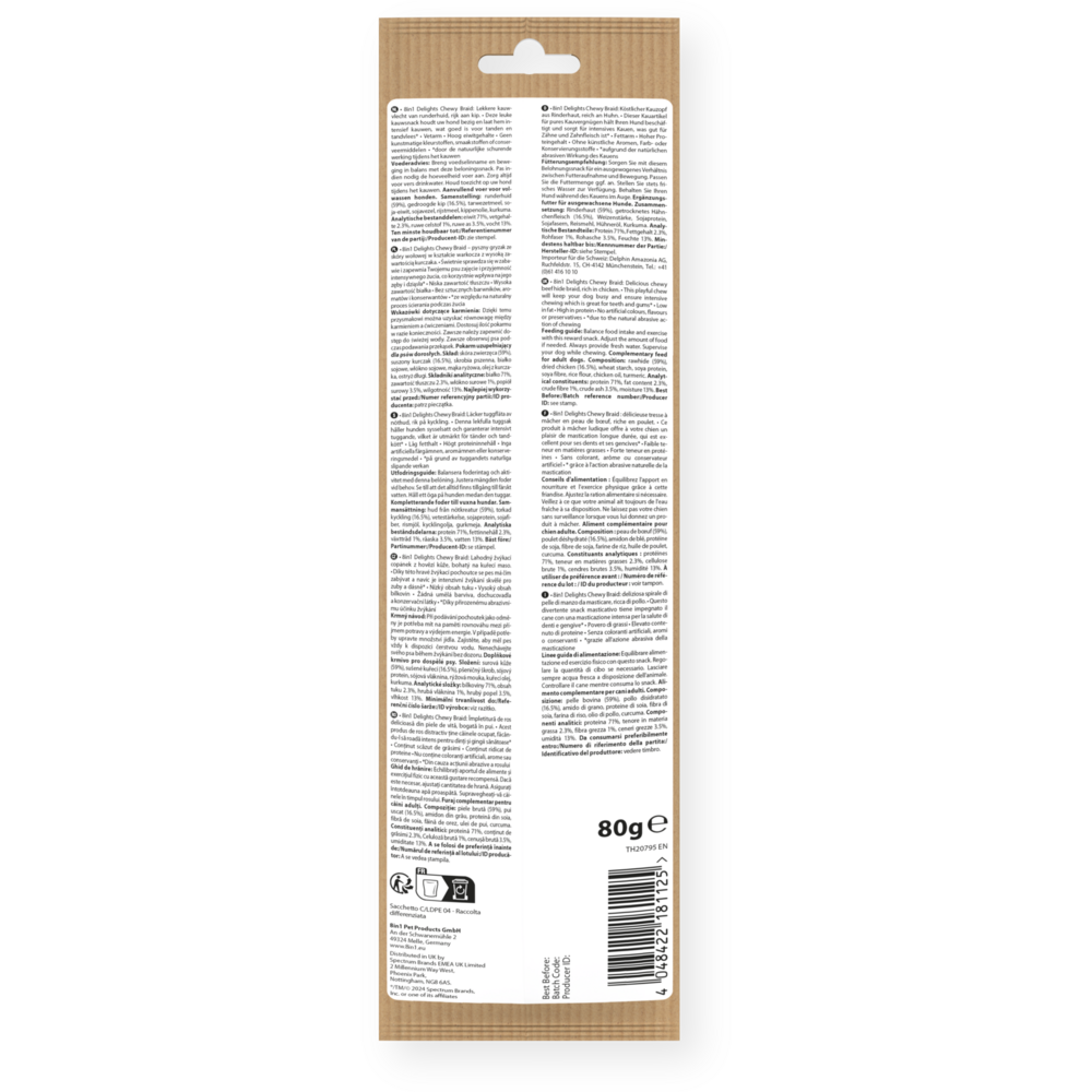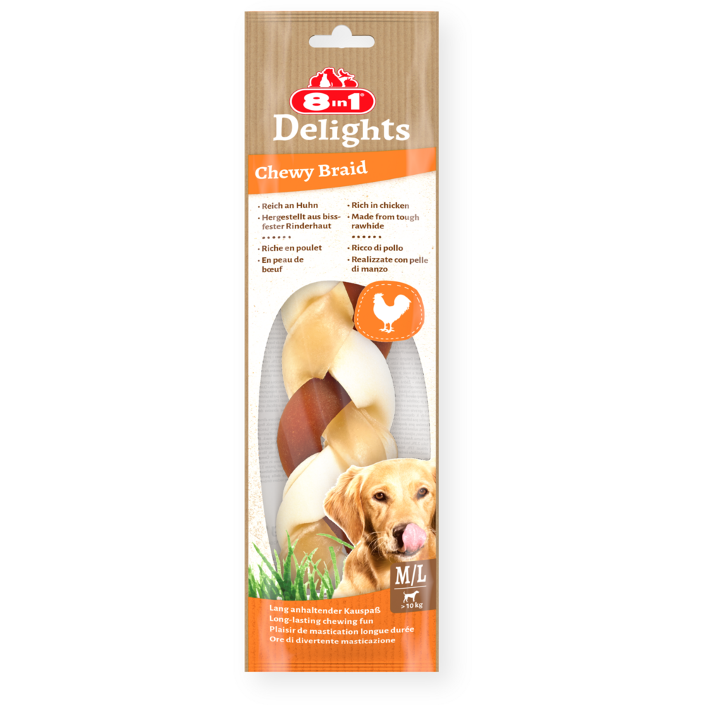 Dieser 8in1 Delights Kauzopf wird aus köstlicher Rinderhaut hergestellt, die ihn besonders bissfest macht, und ist reich an Huhn, was ihn besonders lecker macht. Die Zutaten sind miteinander verflochten, sodass ein verspielter Kauzopf entsteht, den Hunde lieben. Diese Verpackung enthält einen Delights Zopf für lang anhaltenden Kauspaß, mit dem Ihr mittelgroßer bis großer Hund lange beschäftigt bleibt. Dadurch ist er auch gut für Zähne und Zahnfleisch, da die natürliche abrasive Wirkung der Kautätigkeit dazu beiträgt, die Bildung von Zahnbelag und Zahnstein zu verhindern. Der 8in1 Delights Kauzopf enthält weder künstliche Aromen, Farb- und Konservierungsstoffe noch zugesetzten Zucker oder GVO. Außerdem ist dieser schmackhafte, im Ofen gebackene Kauartikel reich an Proteinen und fettarm, was ihn zu einem tollen Snack für Ihren Hund macht.