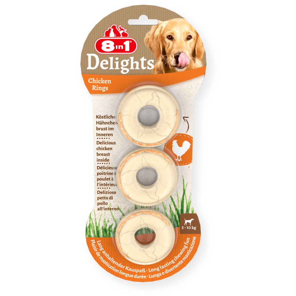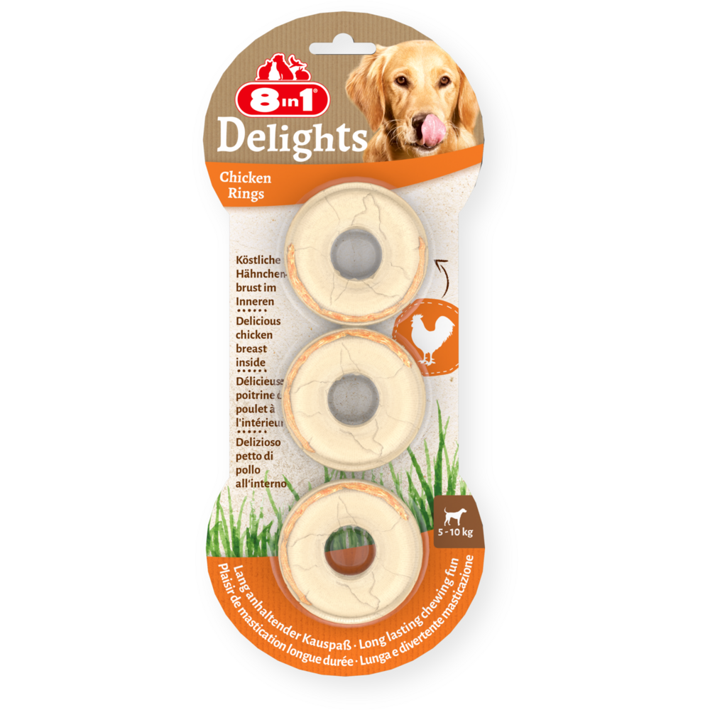 Die optimal auf kleine, zwischen 5 kg und 10 kg wiegende Hunde zugeschnittenen 8in1 Delights Chicken Rings aus leckerer Rinderhaut und köstlicher Hähnchenbrust stehen für ausgiebigen, lang anhaltenden Kauspaß. Aber nicht nur das: Während die Kauringe Ihren Hund genüsslich beschäftigen, unterstützen sie gleichzeitig die Zahnpflege. Denn durch den mechanischen Abrieb beim Kauen wird auf natürliche Weise Zahnstein entfernt. Auf diese Weise tragen die Kauringe zur Zahngesundheit Ihres Hundes bei. Die fettarmen, köstlichen 8in1 Delights Chicken Rings eignen sich hervorragend, um Ihren Hund zu belohnen. Die im Ofen gegarten Kauartikel sind reich an Proteinen, frei von künstlichen Farbstoffen und Geschmacksverstärkern und ohne Zusatz von GVO und Gluten.
