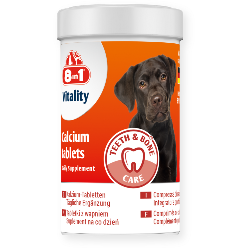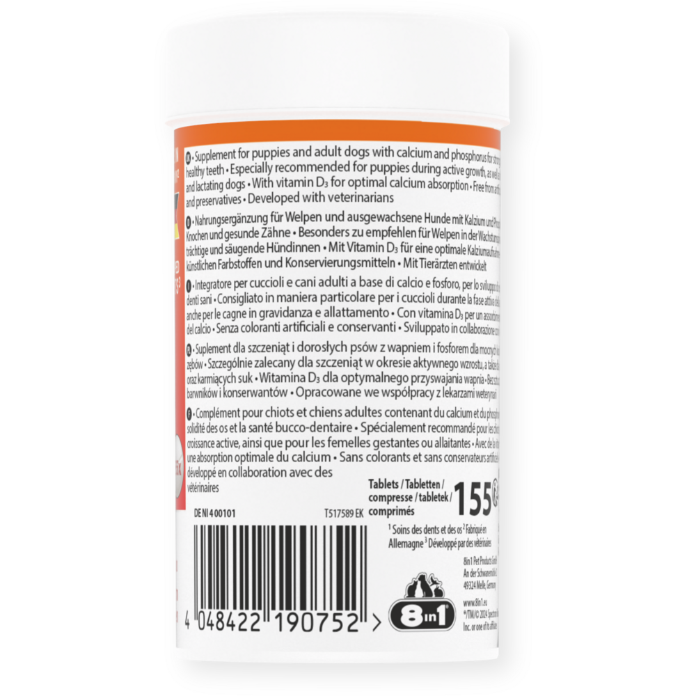 8in1 Kalziumtabletten eignen sich perfekt als tägliche Nahrungsergänzung und leisten einen Beitrag zu starken Knochen und gesunden Zähnen. Sie versorgen Ihren Hund mit Kalzium und Phosphor, die für die Entwicklung und den Erhalt einer gesunden Knochenstruktur unerlässlich sind. Zusätzlich enthalten 8in1 Kalziumtabletten Vitamin D3, um die optimale Aufnahme von Kalzium zu fördern. Die in Zusammenarbeit mit Tierärzten entwickelte Rezeptur empfiehlt sich insbesondere für Welpen während der aktiven Wachstumsphase, die einen höheren Nährstoffbedarf haben als andere Hunde. 8in1 Kalziumtabletten enthalten keine künstlichen Farb- oder Konservierungsstoffe. Sie werden in Deutschland hergestellt.