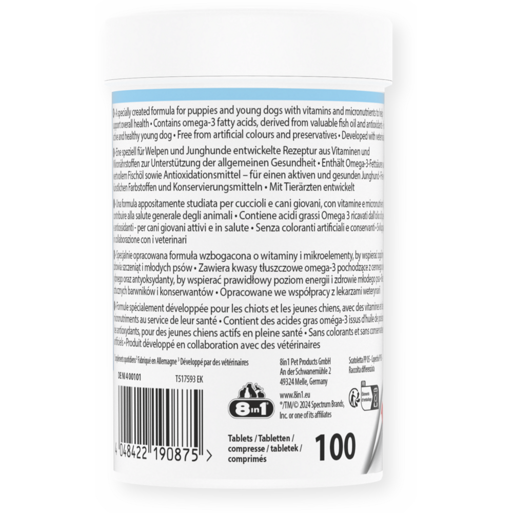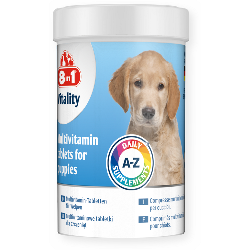 8in1 Multivitamintabletten für Welpen eignen sich perfekt als tägliche Nahrungsergänzung für Welpen und Junghunde. Ihre spezielle Rezeptur beinhaltet Inhaltsstoffe, die auf die Bedürfnisse heranwachsender Welpen abgestimmt sind. Sie leisten einen Beitrag zur Vorbeugung von Problemen, die mit Nährstoffmangel in der Wachstumsphase Ihres Welpen zusammenhängen. 8in1 Vitamintabletten für Welpen versorgen Ihren Welpen mit einer ausgewogenen Mischung aus 11 Vitaminen und 5 essentiellen Mineralstoffen, darunter Vitamin C, E und A, die als natürliche Antioxidantien wirken. Kalzium unterstützt die gesunde Entwicklung von Knochen und Zähnen Ihres Welpen. Die spezifisch für Welpen entwickelte Rezeptur enthält DHA und aus Fischöl gewonnene Omega-3-Fettsäuren, die das gesunde Wachstum und den allgemeinen Gesundheitszustand positiv beeinflussen. In Kombination mit dem gewohnten Futter Ihres Welpen gewährleisten 8in1 Multivitamintabletten, dass Ihr Welpe beim Wachsen die benötigten Nährstoffe erhält. Die in Zusammenarbeit mit Tierärzten entwickelten 8in1 Multivitamintabletten für Welpen enthalten keine künstlichen Farb- und Konservierungsstoffe. Diese hochwertige Nahrungsergänzung wird in Deutschland hergestellt.