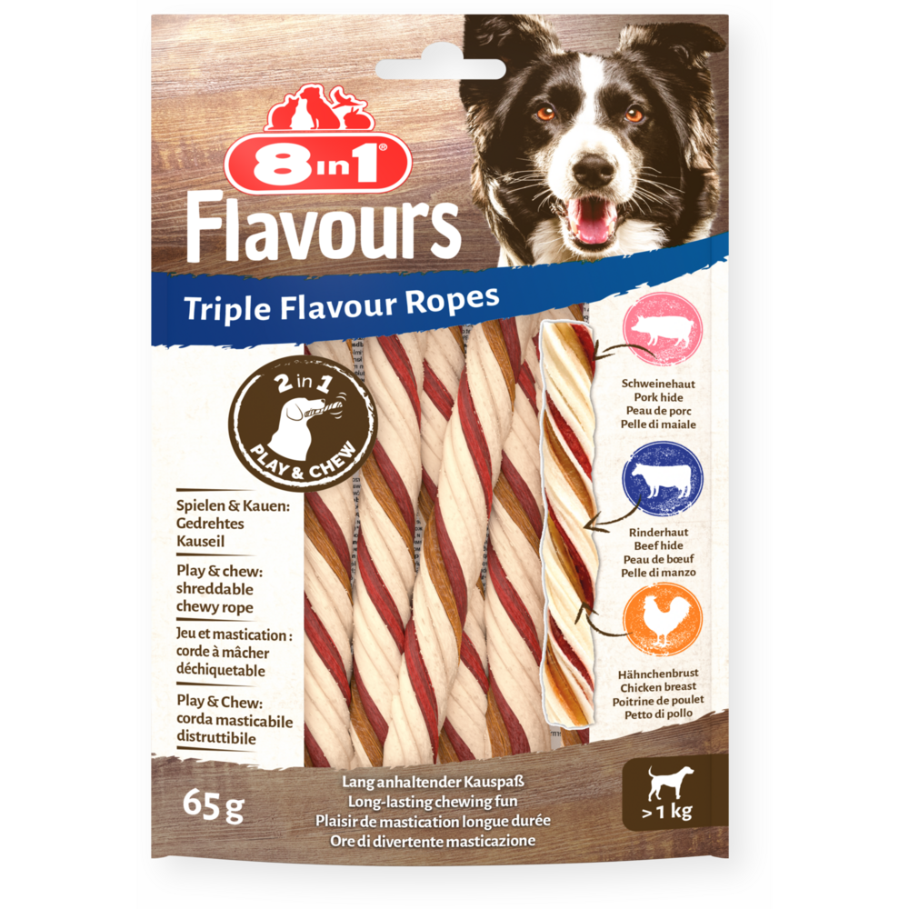 Köstliche Kauseile aus Rinderhaut, verdreht mit Schweinehaut und Hähnchenbrust zu seilförmigen Kausnacks, die Ihr Hund nach Herzenslust auseinanderziehen kann. Diese unterhaltsamen Triple Flavour Ropes sind für Hunde jeder Größe geeignet. Sie halten Ihren Hund beschäftigt und sorgen für intensives Kauen, das gut für Zähne und Zahnfleisch ist*. Fördern Sie die Verspieltheit Ihres Hundes und erfüllen Sie sein Kaubedürfnis mit unseren gedrehten Seilen. Diese Kauseile sind nicht nur lecker, sondern haben auch den Vorteil, dass sie besonders fettarm und proteinreich sind. Verabschieden Sie sich von künstlichen Aromen und Zuckerzusatz, denn unsere Kauseile werden sorgfältig ohne diese Zusatzstoffe hergestellt. Verwöhnen Sie Ihren treuen Begleiter mit einer besonderen, im Ofen gegarten Köstlichkeit, die mit Sicherheit die perfekte Beschäftigung ist und Ihre Liebe auf die bestmögliche Weise zum Ausdruck bringt.