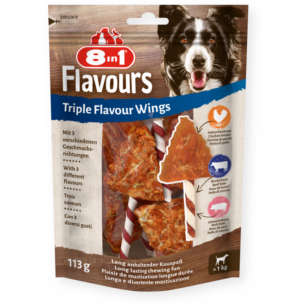 Unsere unglaublich schmackhaften 8in1 Flavours Triple Flavour Wings vereinen drei köstliche Geschmacksrichtungen aus Schweine- und Rinderhaut, umhüllt von köstlicher Hähnchenbrust für ein besonders leckeres Geschmackserlebnis. Diese lang haltenden Kau-Flügel helfen durch ihre natürliche schleifende Wirkung beim Kauen, Zahnstein und Zahnbelag zu bekämpfen. Sie enthalten viel Protein, sind fettarm und frei von Zuckerzusätzen, Geschmacksverstärkern und künstlichen Konservierungsstoffen, so dass sie die ideale Belohnung oder den idealen Snack für Hunde jeder Größe darstellen. Außerdem enthalten sie keine gentechnisch veränderten Organismen und werden sogar im Ofen gebacken, was nicht nur zu ihrer Haltbarkeit beiträgt, sondern auch die wertvollen Nährstoffe erhält. Mit unseren 8in1 Triple Flavour Wings halten Sie Ihren Hund immer bei Laune.
