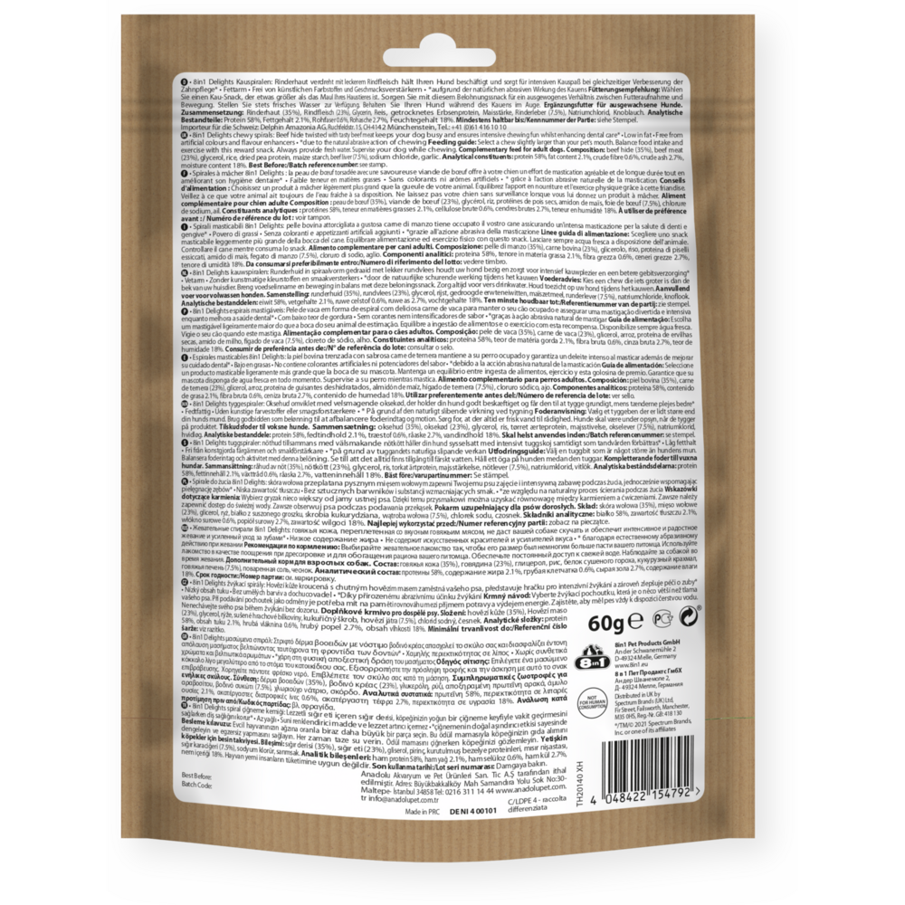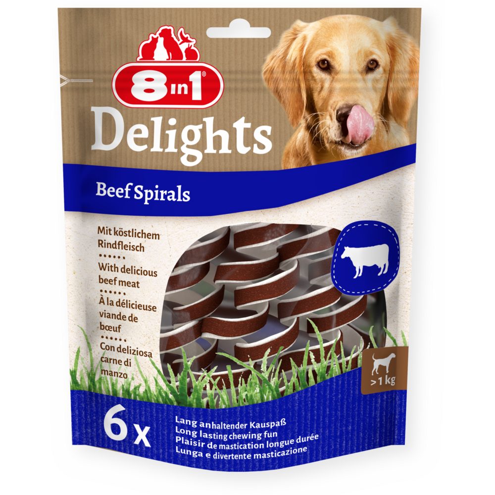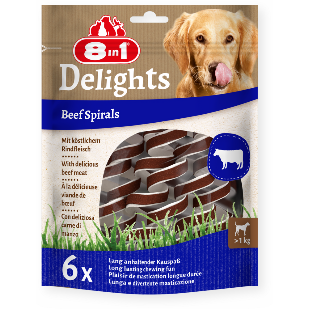 8in1 Delights Beef Spirals bestehen aus schmackhafter Rinderhaut und leckerem Rindfleisch. In Form einer Spirale sorgen sie für lang anhaltenden Kauspaß bei Hunden aller Größen. Und nicht nur das: Die Spiralen beschäftigen Ihren Hund nicht nur, sondern fördern auch die Zahnpflege. Durch den natürlichen Abrieb beim Kauen wird Zahnstein von den Zähnen Ihres Hundes entfernt, und auf diese Weise unterstützen die Spiralen die Zahngesundheit Ihres Hundes. Mit den fettarmen 8in1 Delights Beef Spirals können Sie Ihren Hund mit einem im Ofen gebackenen Kauartikel belohnen, der reich an Proteinen und frei von künstlichen Farbstoffen und Geschmacksverstärkern ist. Außerdem sind sie frei von Zucker, GVO und Gluten. Geben Sie Ihrem vierbeinigen Freund etwas Besonderes und belohnen Sie ihn mit unseren 8in1 Delights Beef Spirals