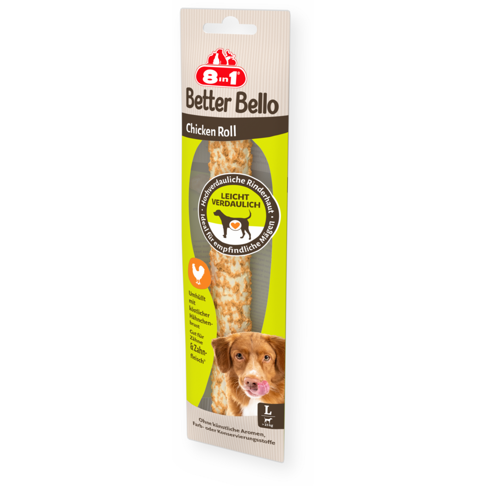Die 8in1 Better Bello Chicken Roll besteht aus hochverdaulichem Rinderhautkollagen. Dadurch ist sie bissfest und bietet eine lange Kauzeit. Gegenüber Kau-Snacks aus herkömmlicher Rinderhaut ist sie leichter verdaulich und daher ideal für empfindliche Mägen. Die abrasive Wirkung des Kauens hilft, Zahnbelag und die Bildung von Zahnstein zu reduzieren, sodass intensives Kauen zu gesünderen Zähnen und Zahnfleisch führt. Wir legen Wert darauf, nur die besten Zutaten zu verwenden und unsere Chicken Roll ohne künstliche Aromen, Farb- oder Konservierungsstoffe herzustellen. Mit einem hohen Protein- und geringen Fettgehalt bietet diese Chicken Roll lang anhaltenden Kauspaß ohne schlechtes Gewissen. Machen Sie Ihrem vierbeinigen Freund mit unseren 8in1 Kau-Snacks eine Freude und lassen Sie ihn den köstlichen Geschmack ungetrübt genießen.