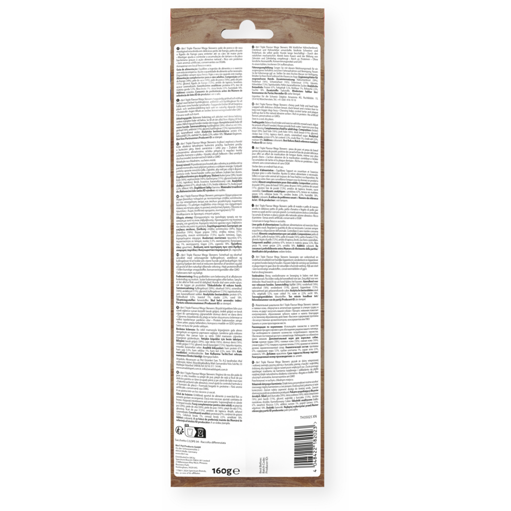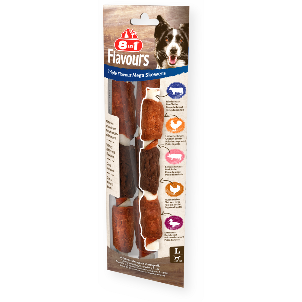Diese köstlichen 8in1 Triple Flavour Mega Skewers sind eine größere Version der beliebten Triple Flavour Skewers und eignen sich perfekt, um größere Hunde länger zu beschäftigen. Ein bissfester Kern aus Schweine- und Rinderhaut ist in schmackhafte Hähnchenbrust, Entenbrust und Hühnerleber gewickelt – ein köstlicher Snack für Hunde. Dieser super leckere, lang anhaltende Kau-Snack beschäftigt auch größere Hunde, und noch besser: er ist gut für Zähne und Zahnfleisch, da der natürliche Abrieb beim Kauen die Bildung von Zahnstein und Zahnbelag auf den Zähnen des Hundes verhindert. Diese köstlichen Mega Skewers enthalten viel Protein und bestehen aus 5 leckeren Fleischsorten, die Hunde lieben. Und nicht nur das: Die 8in1 Triple Flavour Mega Skewers enthalten keine künstlichen Aroma- oder Konservierungsstoffe und sind frei von gentechnisch veränderten Organismen (GVO).
