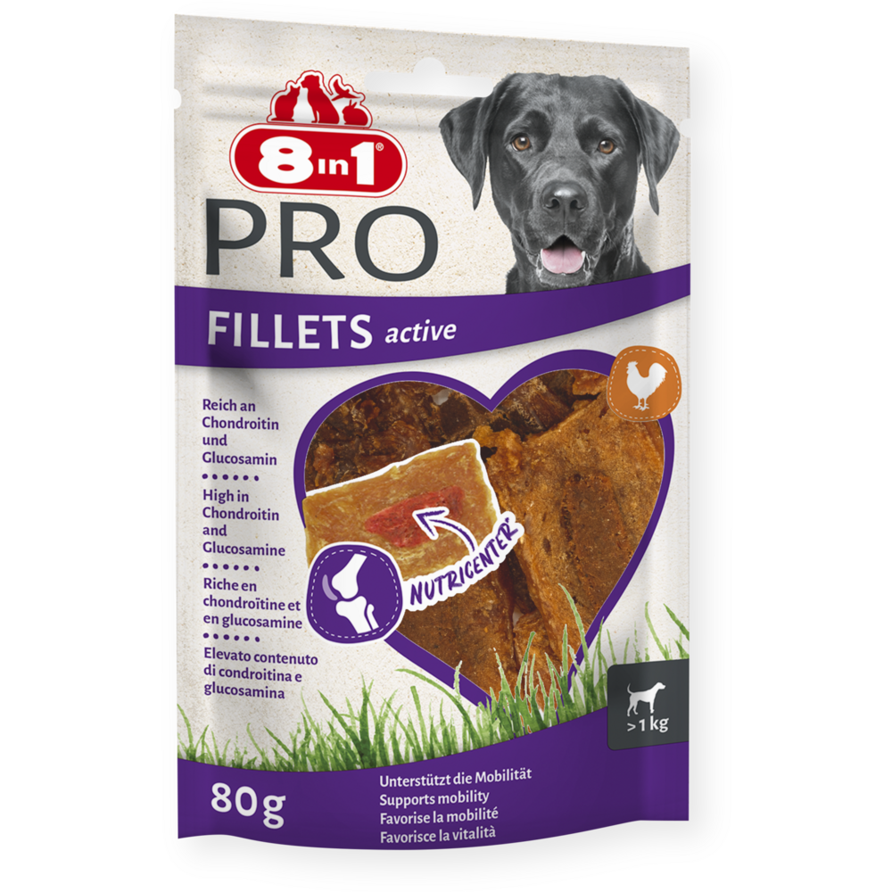 8in1 Pro Fillets Active treats are premium quality, delicious snacks to help keep your dog agile. 8in1 Pro Fillets treats are not only extremely tasty; they also offer your dog a delicious treat with that little bit extra. These snacks consist of tasty chicken breast with a special nutritional core, known as the “Nutri-Center” which has healthy, functional added ingredients to promote your dog’s wellbeing and vitality. The unique Nutri-Center is high in chondroitin and glucosamine, which help your dog to maintain healthy bones and joints. 8in1 Fillets Pro Active are low in fat and high in protein, making them a great healthy reward for in-between meals. Plus they are made with no artificial flavours or preservatives. The resealable bag ensures longer-lasting freshness and you can easily take these snacks with you when you're out and about. 8in1 Fillets Pro are available in three varieties: Pro Active, Pro Dental and Pro Skin & Coat, to suit every dog’s needs.