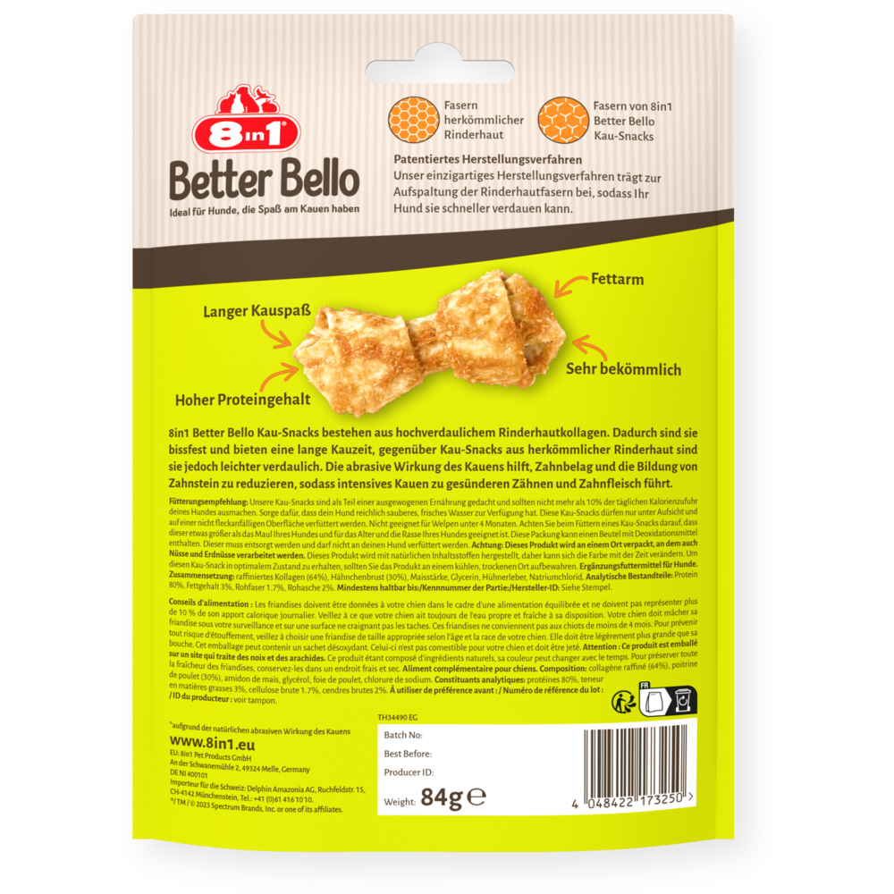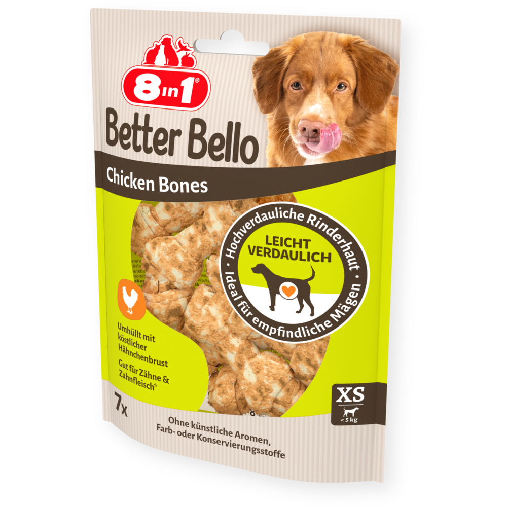 8in1 Better Bello Chicken Bones XS are made from highly digestible rawhide collagen which makes them really tough and long-lasting, but unlike traditional rawhide chews, they’re easier to digest and are therefore great for sensitive tummies. And what’s more, the abrasive action of chewing helps to reduce plaque and tartar build-up so more chewing equals healthier teeth and gums. We take pride in using only best ingredients, ensuring that our Chicken Bones XS contain no artificial colours, flavours, or preservatives. With a high protein content and low fat composition, these bones offer a guilt-free chewing experience that provides long-lasting enjoyment. Treat your furry friend to our chews and let them savor the delicious taste without any remorse.