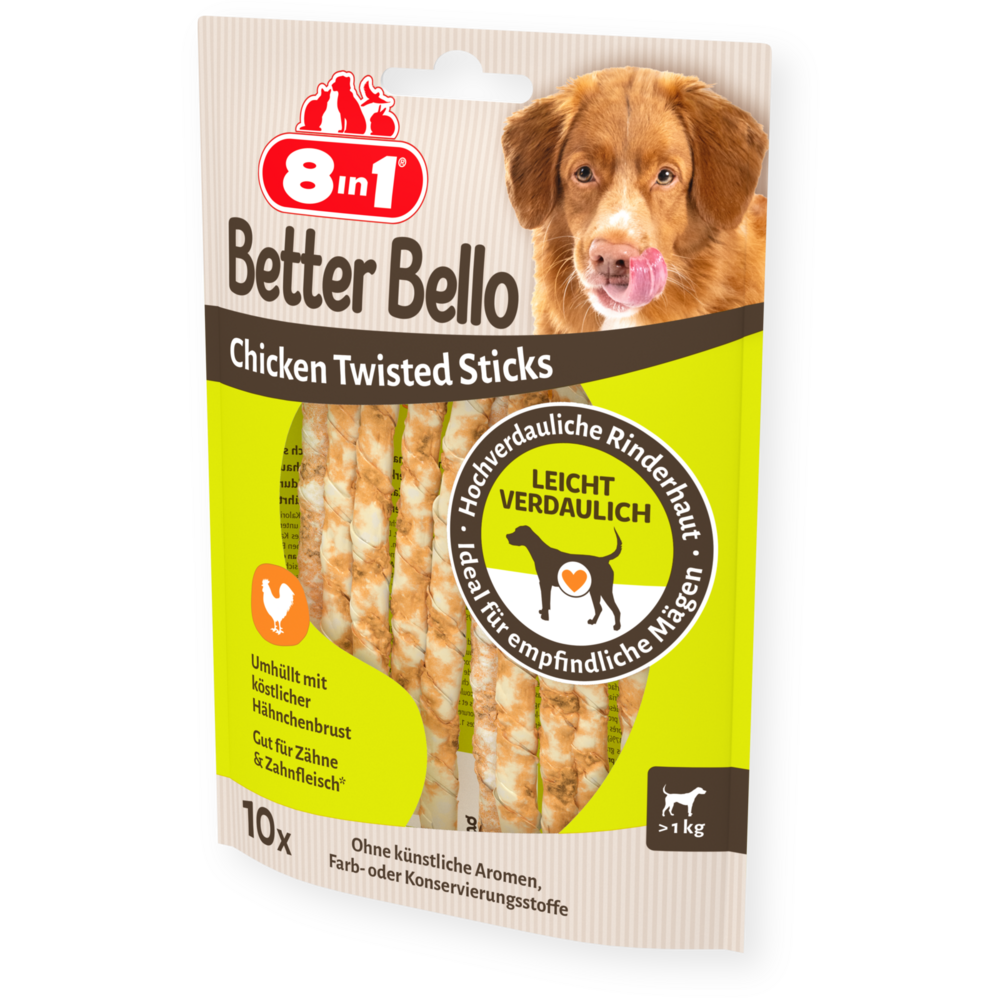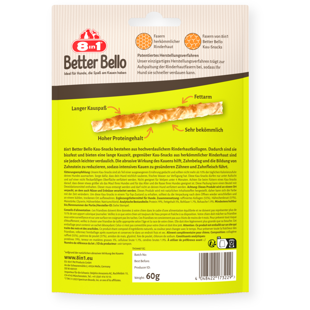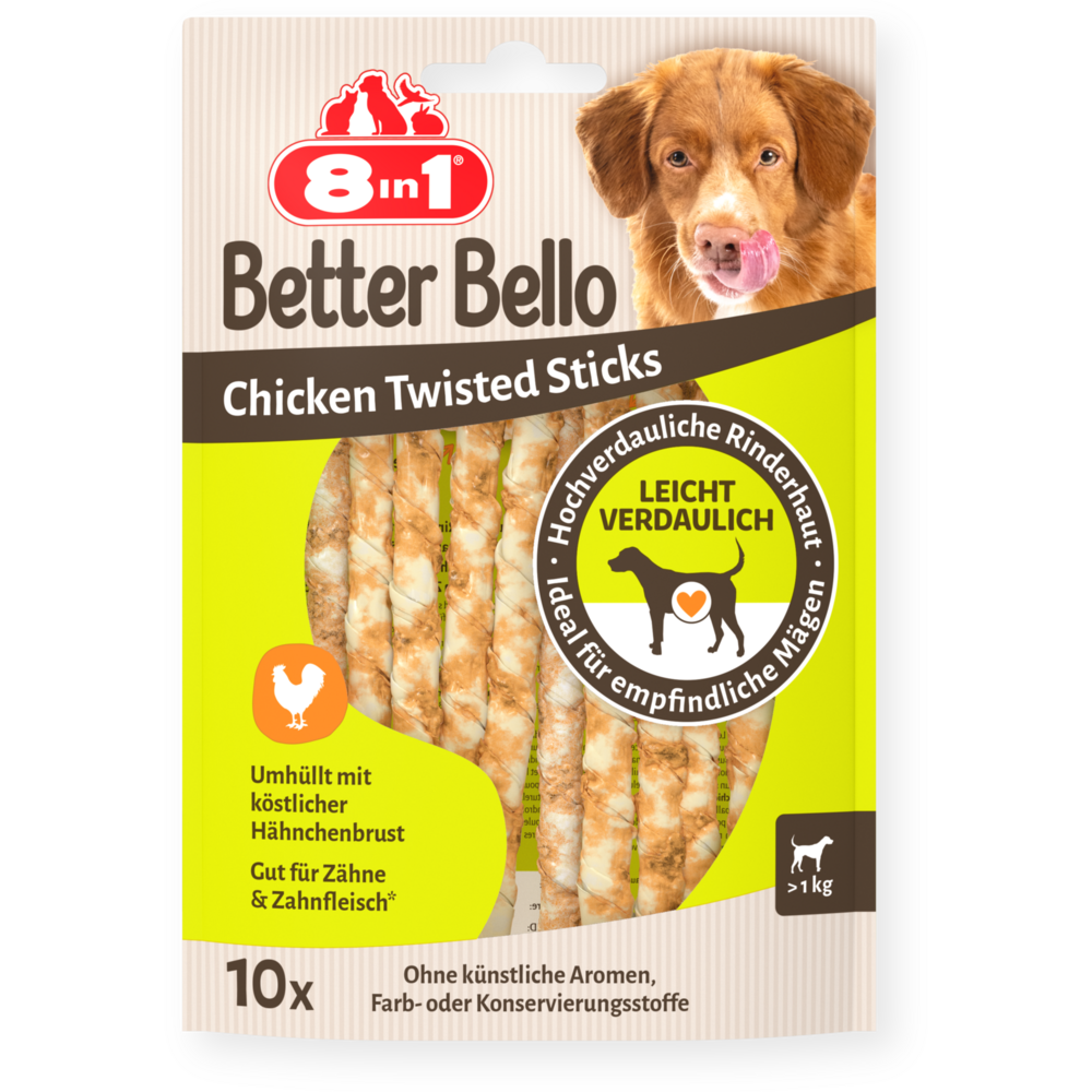 8in1 Better Bello Chicken Sticks are made from highly digestible rawhide collagen which makes them really tough and long-lasting, but unlike traditional rawhide chews, they’re easier to digest and are therefore great for sensitive tummies. And what’s more, the abrasive action of chewing helps to reduce plaque and tartar build-up so more chewing equals healthier teeth and gums. We take pride in using only best ingredients, ensuring that our sticks contain no artificial colours, flavours, or preservatives. With a high protein content and low fat composition, these sticks offer a guilt-free chewing experience that provides long-lasting enjoyment. Treat your furry friend to our chews and let them savor the delicious taste without any remorse.