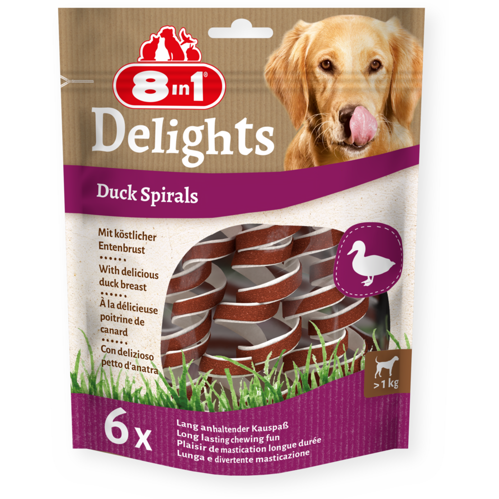 8in1 Delights Duck Spirals are made of tasty beef hide and delicious duck breast. Shaped like a spiral, they ensure long lasting chewing fun and for all size dogs. More than this: while keeping your dog busy, the spirals also enhance dental care. Due to the natural abrasive action of chewing, tartar is removed from your dog's teeth and in that way the spirals support your dog's dental health. By feeding the low in fat 8in1 Delights Duck Spirals you can reward your dog with an oven baked chew that is rich in proteins and free from artificial colours and flavour enhancers. Furthermore, no sugar, GMO's or gluten are added. Get your four-legged friend something special and reward him with our 8in1 Delights Duck Spirals.