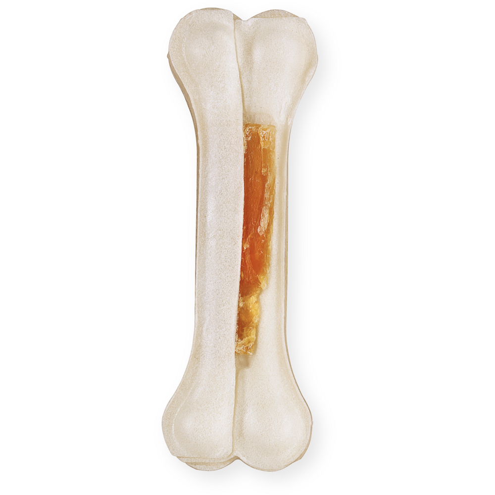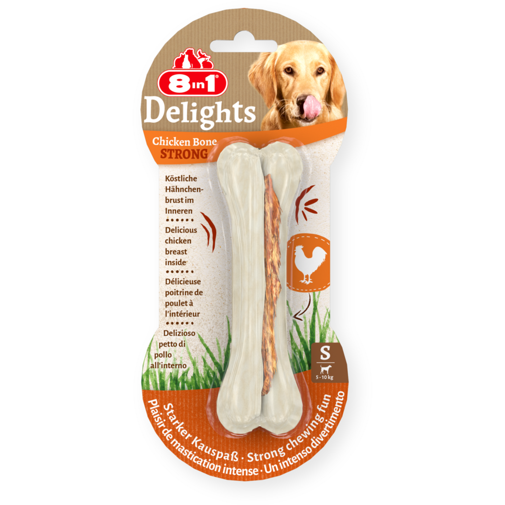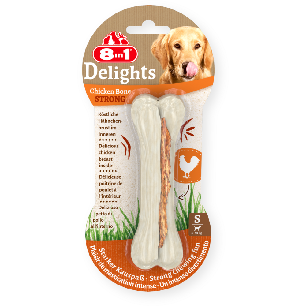 Les os 8in1 Delights Chicken Bones Strong S sont composés d'une savoureuse peau de bœuf et d'une délicieuse poitrine de poulet et offrent aux chiens de petite taille de 5 à 10 kg un effort de mastication intense et de longue durée. Leur consistance en fait une friandise à mâcher ultra-ferme, qui convient donc parfaitement aux chiens à l'instinct de mordillage très développé. Mais ce n'est pas tout : ces os améliorent également leur hygiène dentaire. L'action abrasive naturelle de la mastication élimine le tartre, ce qui favorise la santé bucco-dentaire de votre chien. Pauvres en matières grasses, les os 8in1 Delights Chicken Bones Strong S constituent d'excellents produits à mâcher appétissants pour récompenser votre chien. Ils sont riches en protéines et sans colorant ni arôme artificiel. Par ailleurs, aucun OGM ou gluten n'a été ajouté à ces produits à mâcher cuits au four.