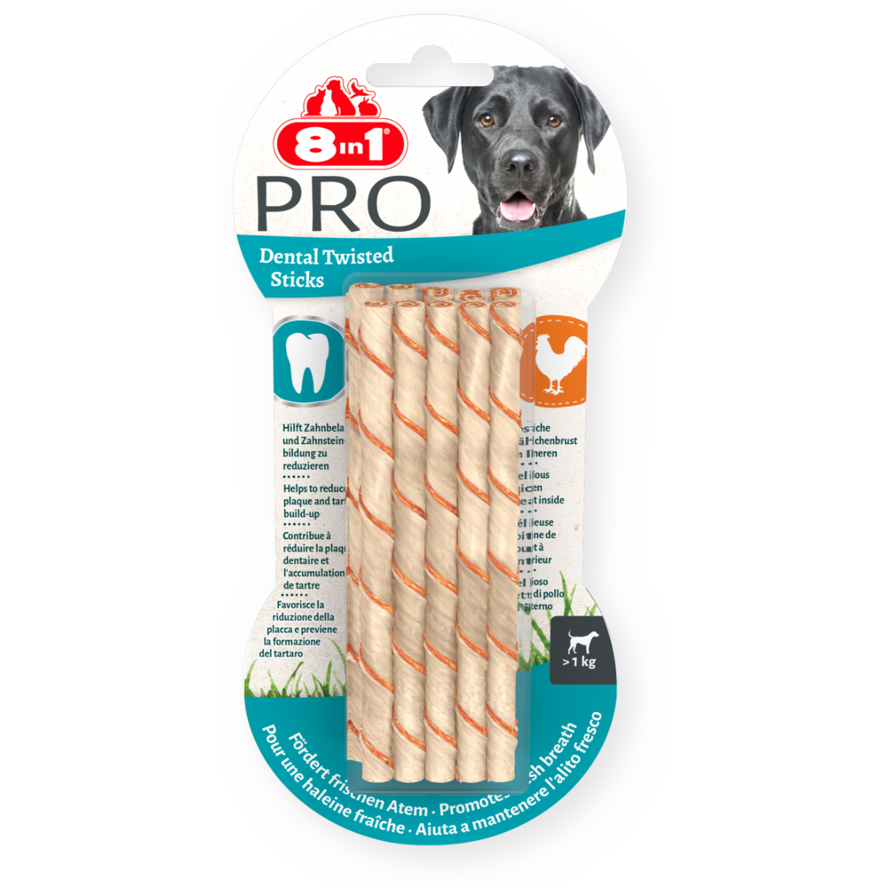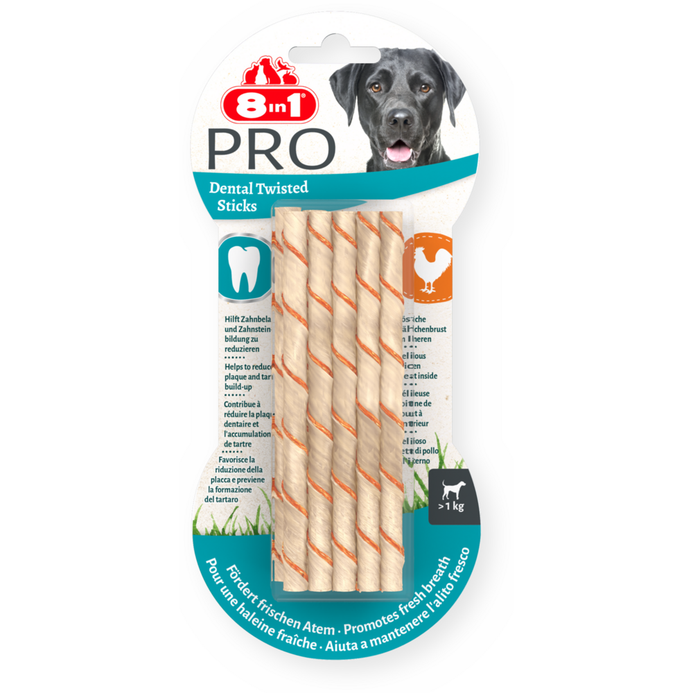 Les Bâtonnets torsadés PRO Dental 8in1 sont la combinaison idéale entre plaisir de mastication longue durée et soins dentaires ! Une peau de bœuf résistante vient entourer une délicieuse poitrine de poulet, le tout, enrichi par une formule anti-plaque et des minéraux purifiants pour les dents. Ces savoureuses friandises à mâcher contribuent à réduire l'accumulation de plaque et de tartre grâce à l'action naturellement abrasive de la mastication et favorisent également une haleine plus fraîche. Ces produits offrent une expérience de mastication naturelle, sans colorants ni arômes. Ils constituent l'alliance parfaite entre plaisir de mastication et friandise pour chien, idéale entre les repas de votre animal et pour lutter contre l'ennui. Les bâtonnets torsadés 8in1 Pro Dental occuperont agréablement votre chien et lui procureront un plaisir de mastication intense visant à améliorer son hygiène bucco-dentaire jusqu'à la dernière bouchée.