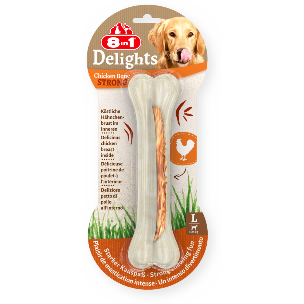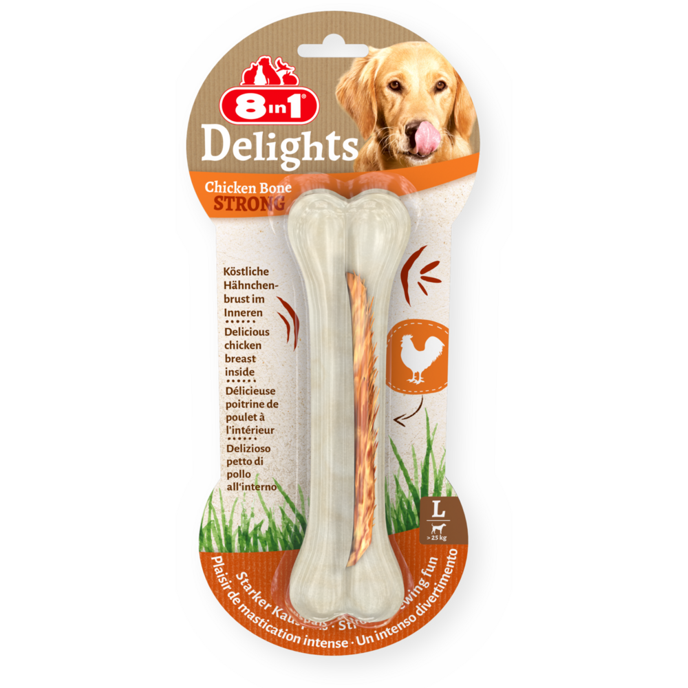 Les os 8in1 Delights Chicken Bones Strong L sont composés d'une savoureuse peau de bœuf et d'une délicieuse poitrine de poulet et offrent aux chiens de grande taille et géants de plus de 25 kg un effort de mastication intense et de longue durée. Leur consistance en fait une friandise à mâcher ultra-ferme, qui convient donc parfaitement aux chiens à l'instinct de mordillage très développé. Mais ce n'est pas tout : ces os améliorent également leur hygiène dentaire. L'action abrasive naturelle de la mastication élimine le tartre, ce qui favorise la santé bucco-dentaire de votre chien. Pauvres en matières grasses, les os 8in1 Delights Chicken Bones Strong L constituent d'excellents produits à mâcher appétissants pour récompenser votre chien. Ils sont riches en protéines et sans colorant ni arôme artificiel. Par ailleurs, aucun OGM ou gluten n'a été ajouté à ces produits à mâcher cuits au four.