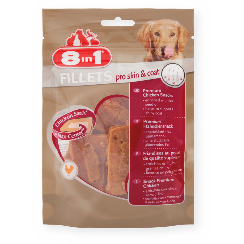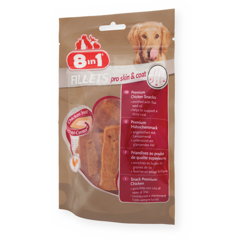 Les friandises 8in1 Fillets Pro Skin & Coat sont des friandises savoureuses de grande qualité qui aident votre chien à se présenter sous son meilleur jour. Délicieuses et pauvres en matières grasses, elles sont en plus excellentes pour sa santé. Elles se composent d’une savoureuse viande de poulet enrichie en nutriments spéciaux, le cœur « Nutri-Center ». Ces ingrédients favorisent le bien-être de votre chien et décuplent sa vitalité. Le Nutri-Center est enrichi en huile de lin et contient entre 80 et 90 % d’acides gras oméga-3. Ces friandises sont particulièrement recommandées si la peau de votre chien est sèche et squameuse. Les 8in1 Fillets Pro Skin & Coat sont des récompenses saines à proposer entre les repas : elles ne comportent que 4,5 % de matières grasses. Le sachet refermable permet d’emporter ces friandises lors de toutes vos aventures avec votre compagnon. Par ailleurs, les 8in1 Fillets Pro sont disponibles en trois autres déclinaisons : Pro Dental, Pro Active et Pro Digest pour répondre aux besoins de tous les chiens.