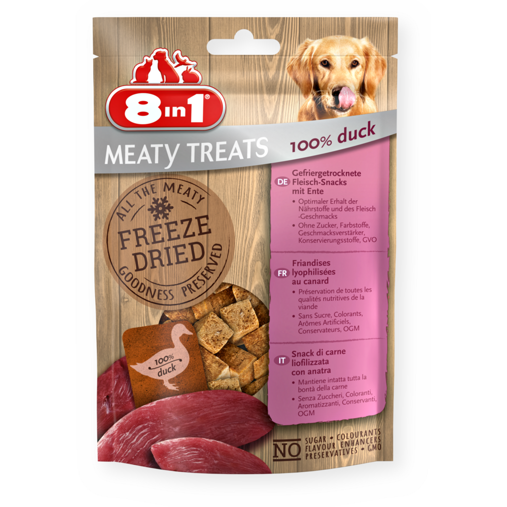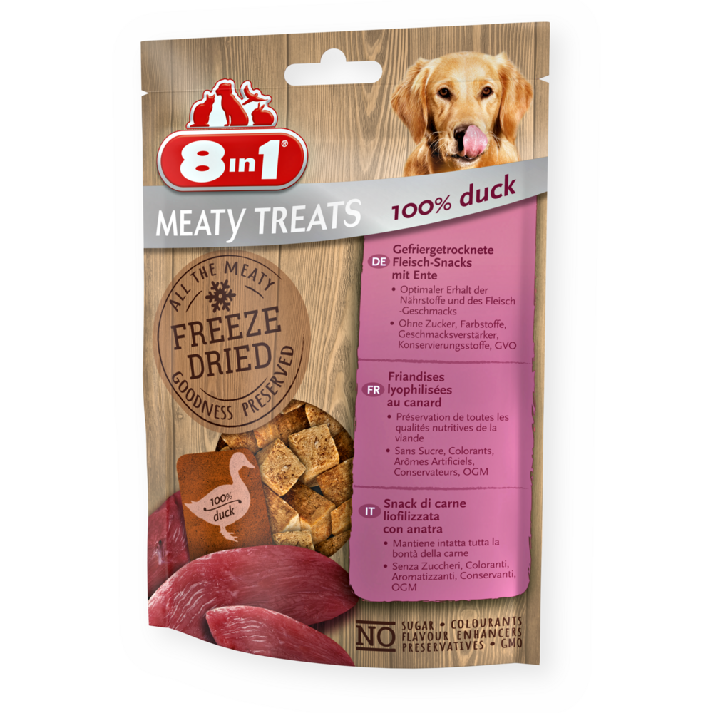 Si vous voulez établir une relation privilégiée avec votre animal, offrez-lui une récompense pour un bon comportement, ou tout simplement parce qu’il le mérite. N’hésitez pas à ouvrir un sachet de Meaty Treats 8in1 ! Nos friandises sont lyophilisées avec soin pour préserver les qualités nutritionnelles et gustatives du magret de canard.