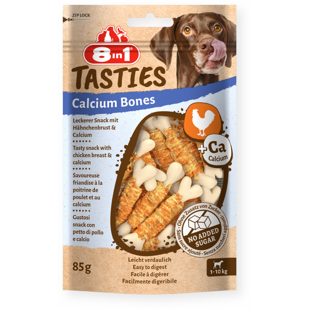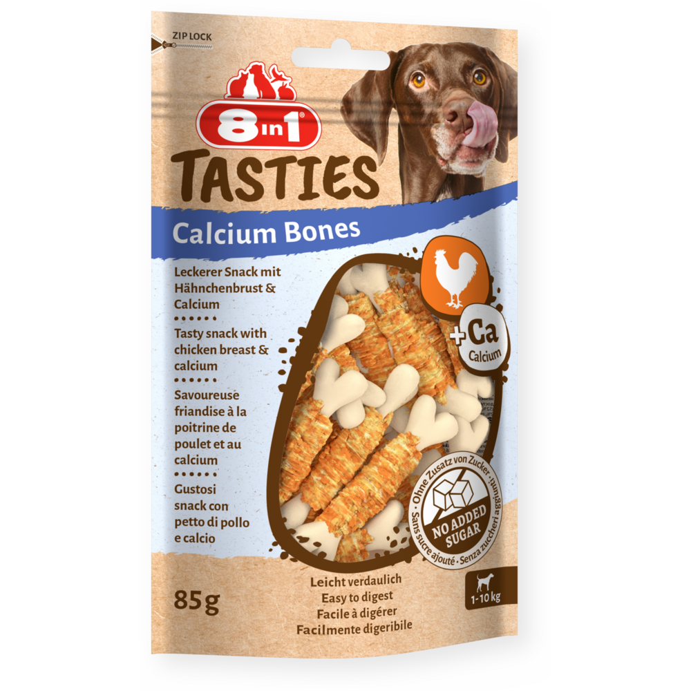 Les 8in1 Calcium Bones sont faciles à digérer, sans sucre ajouté et pauvres en matières grasses. Leur formule est sans colorants ni arômes artificiels ni OGM ni conservateurs. Ces friandises cuites au four sont riches en protéines. Les friandises 8in1 Tasties Calcium Bones sont idéales pour les chiens de race miniature et de petite race. Alors, faites-en profiter votre chien !