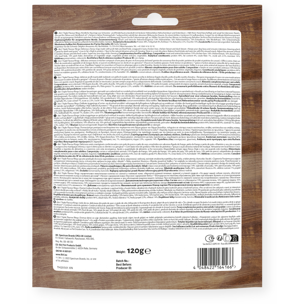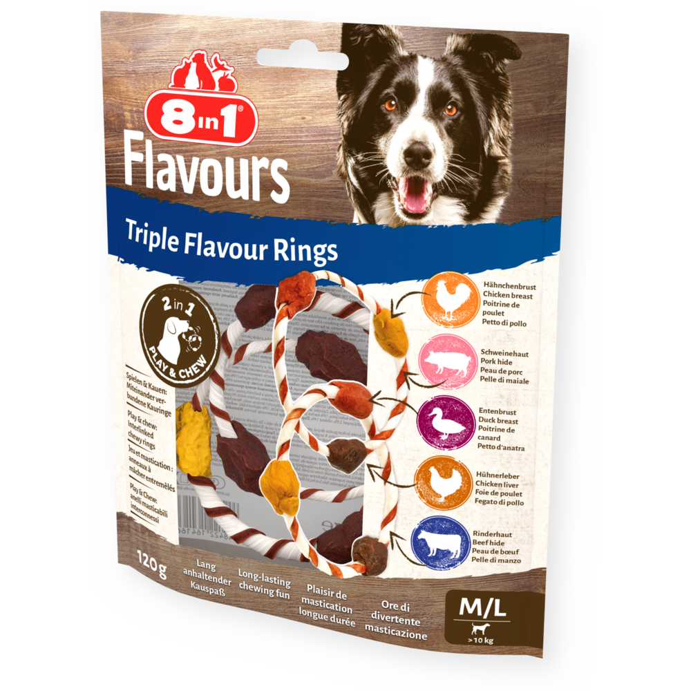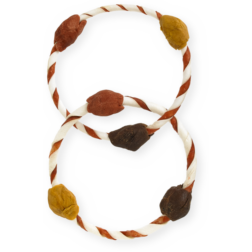 De délicieux anneaux à mâcher avec de la peau de porc et de bœuf, enveloppés de savoureux foie de volaille, de blanc de poulet et de magret de canard. Ces anneaux triples saveurs ludiques de taille M/L occupent votre chien et lui permettent de mastiquer intensément, ce qui est excellent pour les dents et les gencives *. Encouragez le caractère joueur de votre chien et satisfaites son instinct de mastication grâce à nos anneaux entrelacés. Non seulement ces anneaux sont délicieux, mais ils ont l'avantage d'être pauvres en matières grasses et riches en protéines. Dites adieu aux arômes artificiels et au sucre ajouté, car nos anneaux sont fabriqués avec soin sans ces additifs. Offrez à votre compagnon à quatre pattes une friandise spéciale, cuite au four, qui sera la plus belle des récompenses et lui montrera combien vous l'aimez.