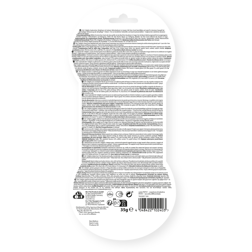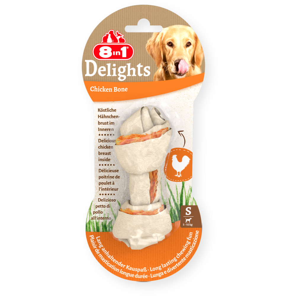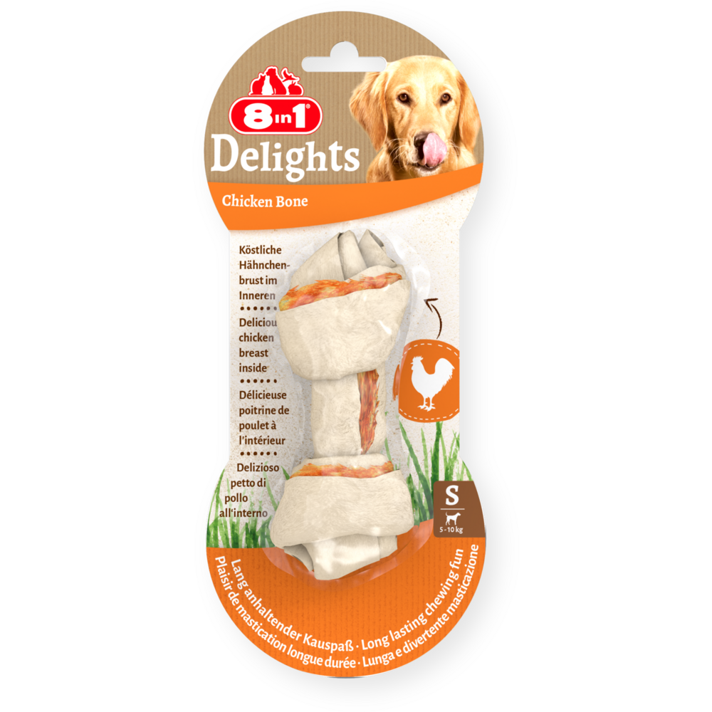 Az 8in1 Delights kis méretű (S), csirkéből készült rágócsontok ízletes marhabőrből és csirkemellből állnak és intenzív, hosszan tartó rágási élményt nyújtanak az 5 és 10 kg testtömeg közötti, kisméretű kutyák számára. Ami még fontosabb: míg az állat lefoglalja magát, a rágócsont ápolja a kutya fogazatát. A rágás természetes dörzsölő hatása miatt a rágócsont eltávolítja a lepedéket, így támogatva kutyája fogainak egészségét. A zsírszegény 8in1 Delights kis méretű (S), csirkéből készült rágócsonttal tökéletes, ínycsiklandó finomsággal jutalmazhatja meg kedvencét. A termék fehérjében gazdag és nem tartalmaz mesterséges színezőanyagot és ízfokozót sem. Ezenkívül cukrot, GMO-t tartalmazó összetevőt és glutént sem adtunk a sütőben sült rágócsontokhoz.