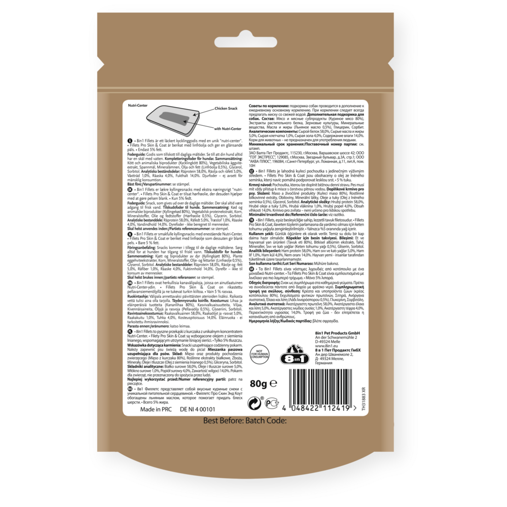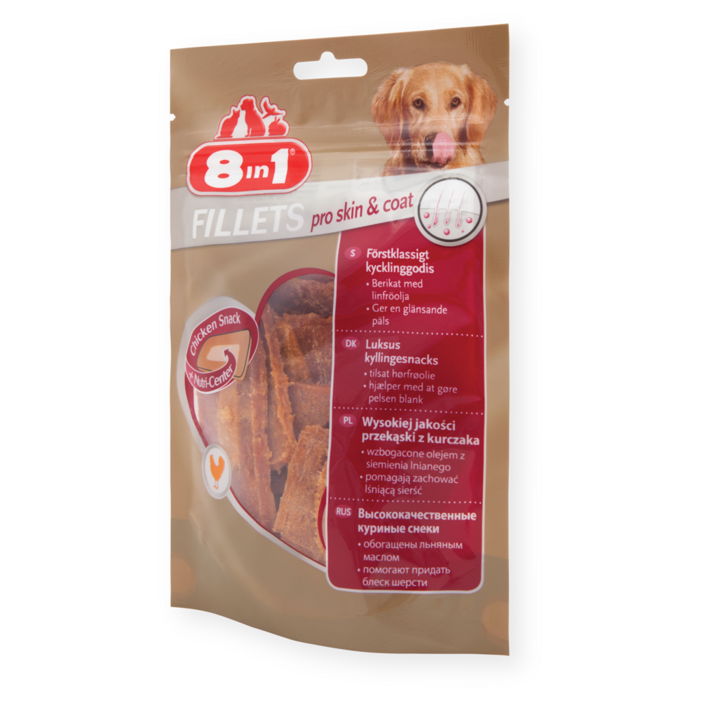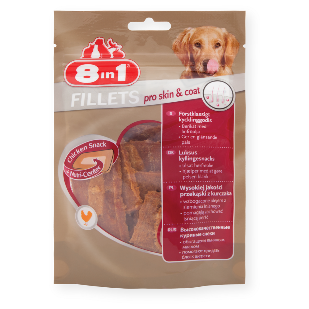 Az 8in1 Fillets Pro Skin & Coat prémium minőségű jutalomfalat ízletes rágcsálnivaló kutyája optimális megjelenéséért. Az 8in1 Fillets Pro jutalomfalatok nemcsak különösen zamatosak, de zsírtartalmuk is alacsony, így kutyája ízletes jutalomfalathoz juthat egy kis extrával. Ezek a finomságok ízletes csirkével készülnek egy különleges "Nutri-Centre" tápanyagmaggal, mely további egészséges és hasznos összetevőkkel segíti kutyája jó közérzetét és vitalitását. A lenmagolajjal gazdagított, egyedülálló Nutri-Centre tápanyagmag 80-90% omega-3 zsírsavat tartalmaz. Ezek a falatok különösen előnyösek akkor, ha kutyája bőre száraz és hámlik. Az 8in1 Fillets Pro Skin & Coat csupán 4,5% zsírt tartalmaz, így a főétkezések között kutyája egészséges jutalomban részesülhet. A visszazárható tasaknak köszönhetően a finomságokat kirándulásra, utazásra is magával viheti. Az 8in1 Fillets Pro a következő ízekben kapható: Pro Dental, Pro Active és Pro Digest, így minden kutya igényeit kielégíti.