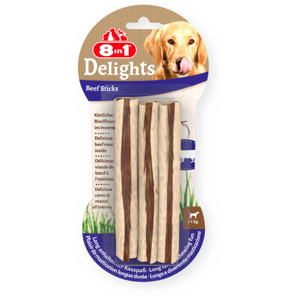 Az 8in1 Delights Beef Sticks marhahúsos rudak ízletes marhabőrből és marhahúsból készülnek, és intenzív, hosszantartó rágási élményt nyújtanak kutyája számára. Mi több: míg az állat lefoglalja magát, a rudak ápolják a kutya fogazatát. A rágás természetes dörzsölő hatása miatt a rudak eltávolítják a lepedéket, így támogatva kutyája fogainak egészségét. A zsírszegény 8in1 Delights Beef Sticks marhahúsos rudakkal tökéletes, ínycsiklandó finomsággal jutalmazhatja meg kutyáját. A termék fehérjében gazdag, és nem tartalmaz mesterséges színezőanyagokat és ízfokozókat sem. Ezenkívül GMO-t tartalmazó összetevőt és glutént sem adtunk a kemencében sült rágócsontokhoz.