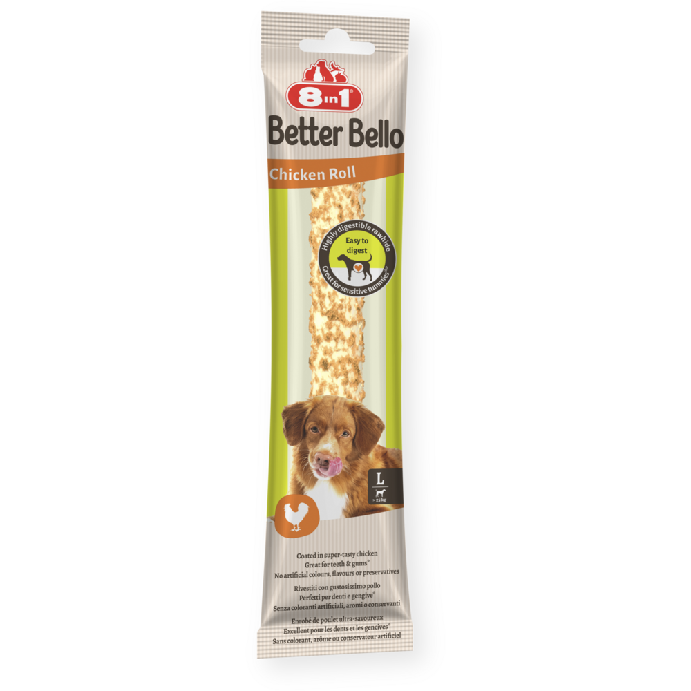 A 8in1 Better Bello L csirkés tekercs könnyen emészthető nyersbőr kollagénből készül, amitől igazán erős és hosszan tartó lesz, de a hagyományos nyersbőr rágócsontokkal ellentétben könnyebben emészthető, ezért érzékeny gyomrú állatok számára is nagyszerű. Ráadásul a rágás dörzshatása segít eltávolítani a lepedéket és gátolja a fogkőképződést, így a több rágás egészségesebb fogakat és ínyt jelent. Büszkék vagyunk arra, hogy csak a legjobb összetevőket használjuk, így biztosítva, hogy az L csirkés tekercs nem tartalmaz mesterséges színezéket, aromát vagy tartósítószert. A csirkés tekercset a magas fehérjetartalmának és alacsony zsírtartalmának köszönhetően bűntudat nélkül lehet rágcsálni, hosszú ideig, élvezettel. Lepje meg bundás kedvencét rágócsontjainkkal, hadd élvezzék ezt a finomságot lelkiismeret-furdalás nélkül.