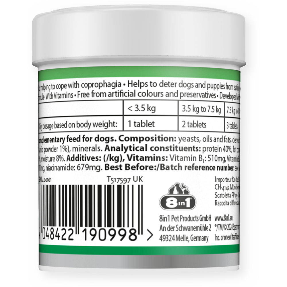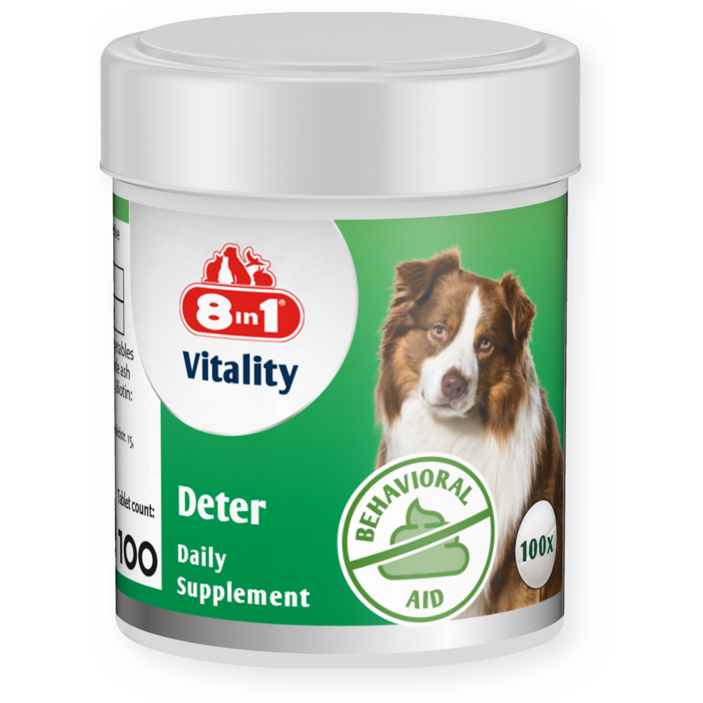 A 8in1 Deter tabletta ideális mindennapi táplálékkiegészítő kölyök- és felnőtt kutyák számára, amely segít eltántorítani őket a saját ürülékük elfogyasztásától (koprofágia). Az állatorvosokkal közösen kifejlesztett formula élesztőt, halolajakat és zöldségeket tartalmaz. Biztonságos és hatékony formulánk nem kívánatos ízűvé teszi az ürüléket, így segít megelőzni a koprofágiát. A tablettát továbbá számos vitaminnal és ásványi anyaggal gazdagították. A 8in1 Deter tabletta mesterséges színezékek és tartósítószerek nélkül készül. Ezt a kiegészítőt Németországban gyártják.