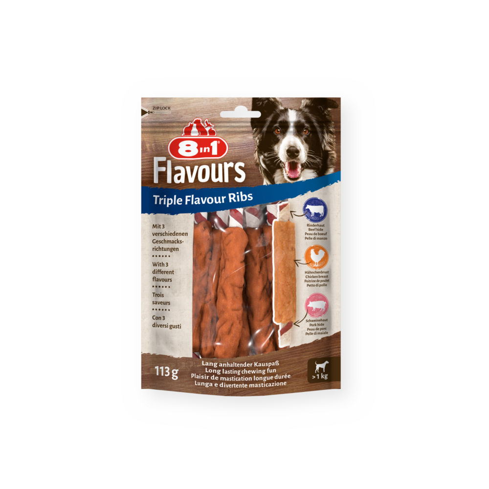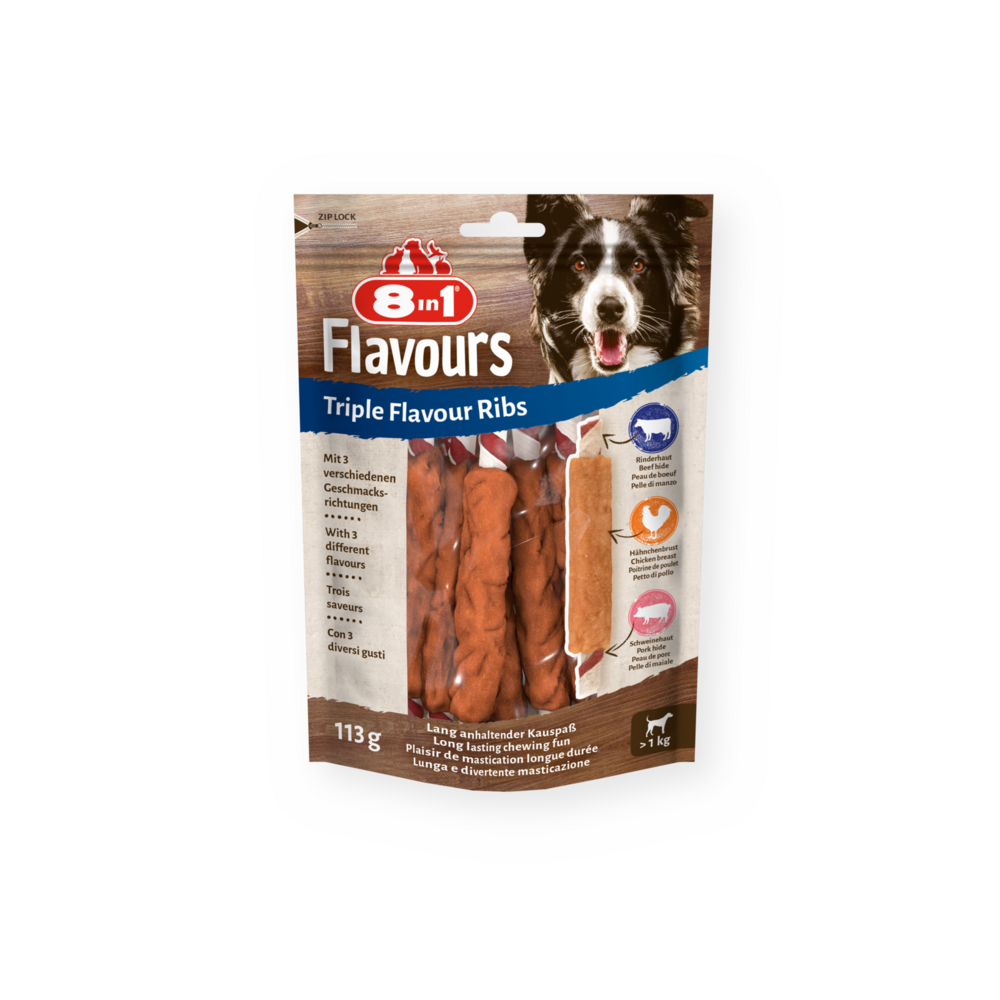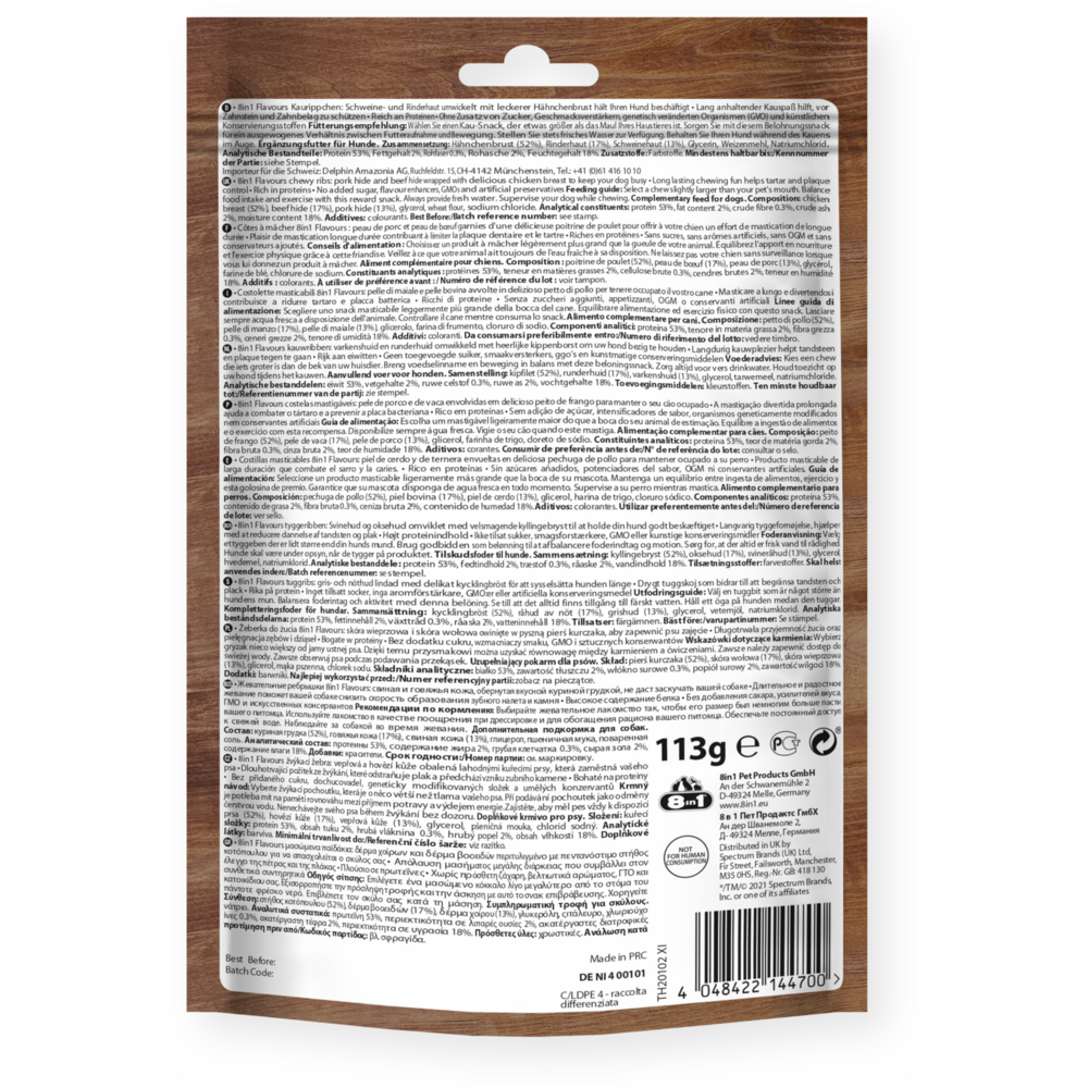 Rendkívül ízletes, háromízű 8in1 rágócsontjaink a rágható sertés- és marhabőr három finom ízét ötvözik, az extra ízletes ízélmény érdekében finoman zamatos csirkemellbe csomagolva. Ezek a sokáig tartó, rágócsontok rágás során segítenek megfékezni a fogkő és a lepedék felhalmozódását azok természetes koptató hatása miatt. Fehérjében gazdagok, alacsony zsírtartalmúak és nem tartalmaznak hozzáadott cukrot, ízfokozókat és mesterséges tartósítószereket, így bármely méretű kutya számára ideális jutalomfalatok vagy finomságok. Ezenkívül génmódosított élelmiszereket sem tartalmaznak, és sütőben készülnek, ami nem csak a tartósságot, hanem az értékes tápanyagok megőrzését is elősegíti. Tartsa lefoglalva kutyáját háromízű 8in1 rágófalatjainkkal.