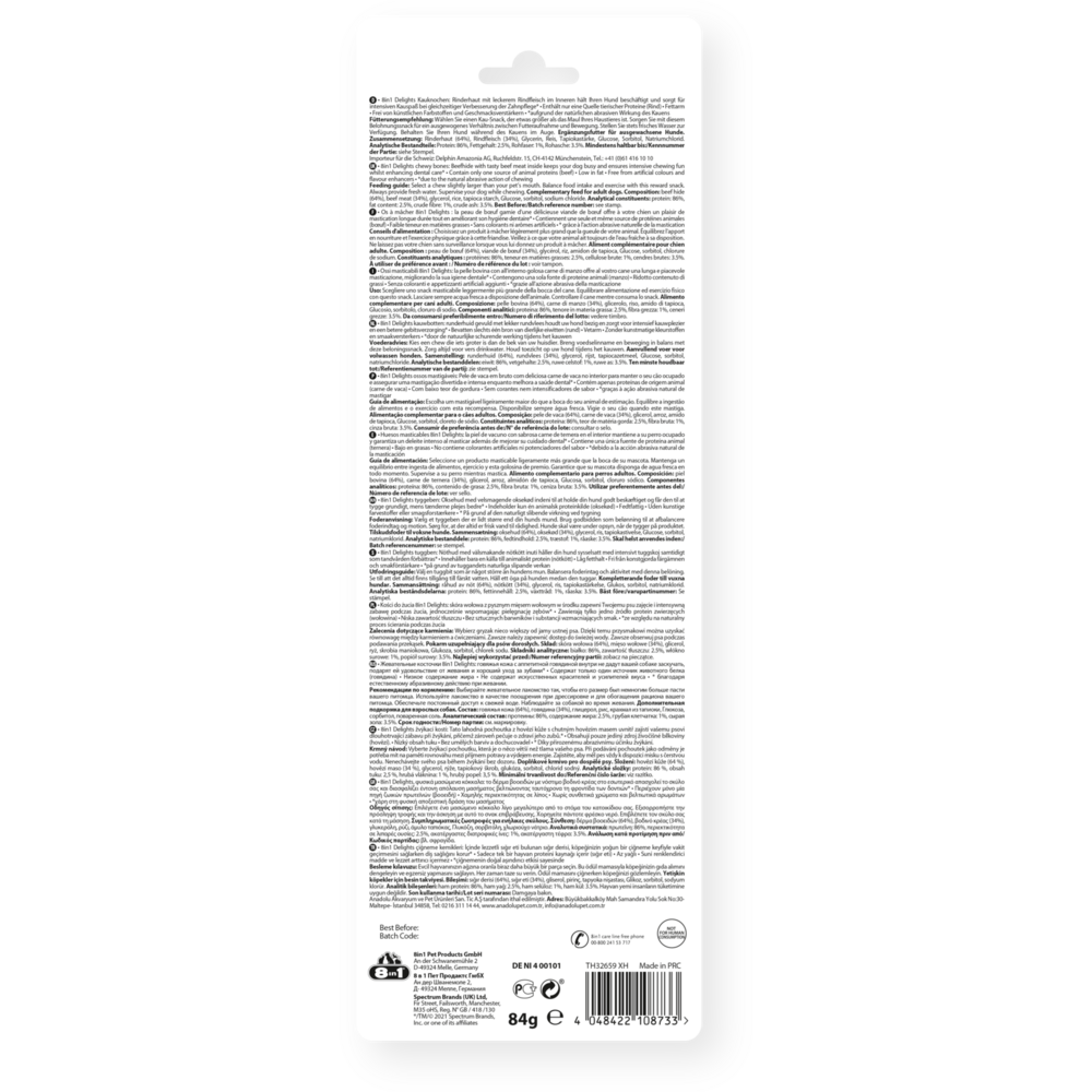 Gli ossi di manzo XS 8in1 Delights sono fatti con gustosa pelle di manzo e deliziosa carne di manzo, per una masticazione intensiva e a lunga durata, per cani toy con un peso sotto i 5 kg. Inoltre: mentre mantengono occupato il vostro cane, gli ossi migliorano la cura dentale. Grazie alla naturale azione abrasiva della masticazione, il tartaro viene rimosso dai denti del vostro cane e, in questo modo, viene favorita la sua salute dentale. Gli ossi di manzo XS 8in1 Delights, a basso contenuto di grassi, sono lo snack perfetto per premiare il vostro cane. Sono ricchi di proteine e privi di coloranti e appetizzanti artificiali. Inoltre durante la cottura non vengono aggiunti zucchero, OGM e glutine.