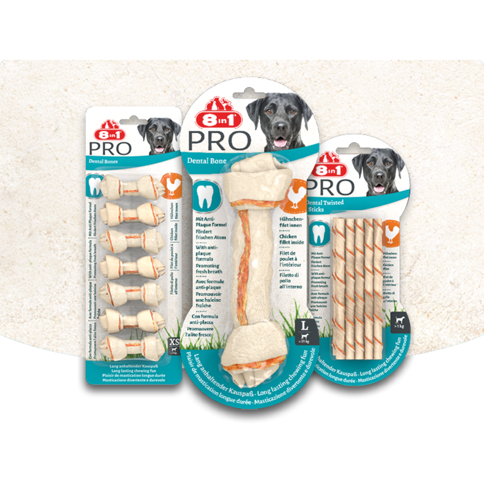 Gustosi snack masticabili a base di pelle bovina e arricchiti con minerali e formula anti-placca.
