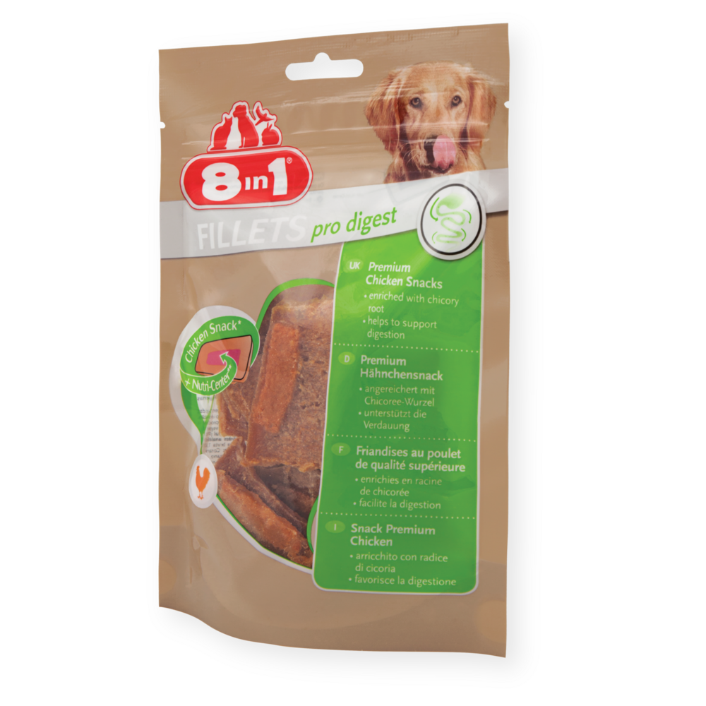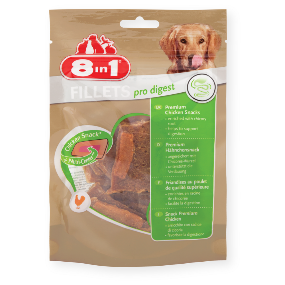 8in1 Fillets Pro Digest zijn heerlijke snacks van premium kwaliteit die de spijsvertering van uw hond ondersteunen. 8in1 Fillets Pro snacks zijn niet alleen bijzonder lekker met een laag vetgehalte, maar bieden uw hond net dat beetje extra. Deze snacks van smakelijke kipfilet bevatten binnenin een voedzame kern, het zogenaamde nutri-center, met gezonde ingrediënten die het welzijn en de vitaliteit van uw hond ondersteunen. Het unieke nutri-center bevat cichoreiwortel met waardevol, prebiotisch werkzaam inuline, een voedingsstof voor de nuttige bacteriën in de darm. Met slechts 4,5% vet is 8in1 Fillets Pro Digest een gezonde beloning voor tussendoor. Dankzij de hersluitbare zak kunt u de snacks gemakkelijk meenemen voor onderweg. 8in1 Fillets Pro zijn beschikbaar in vier smaken: Pro Digest, Pro Active, Pro Dental en Pro Skin & Coat om aan de behoefte van elke hond te voldoen.