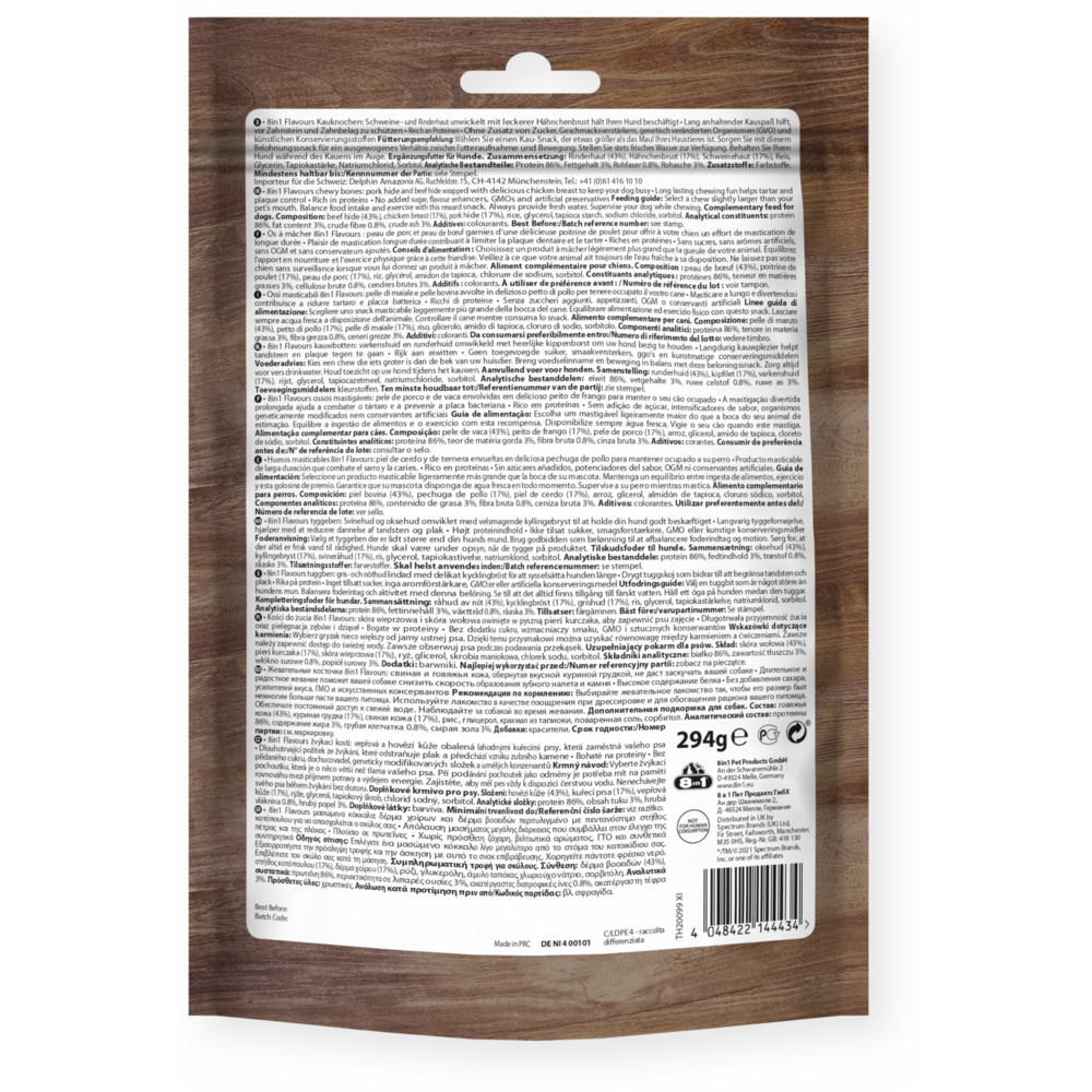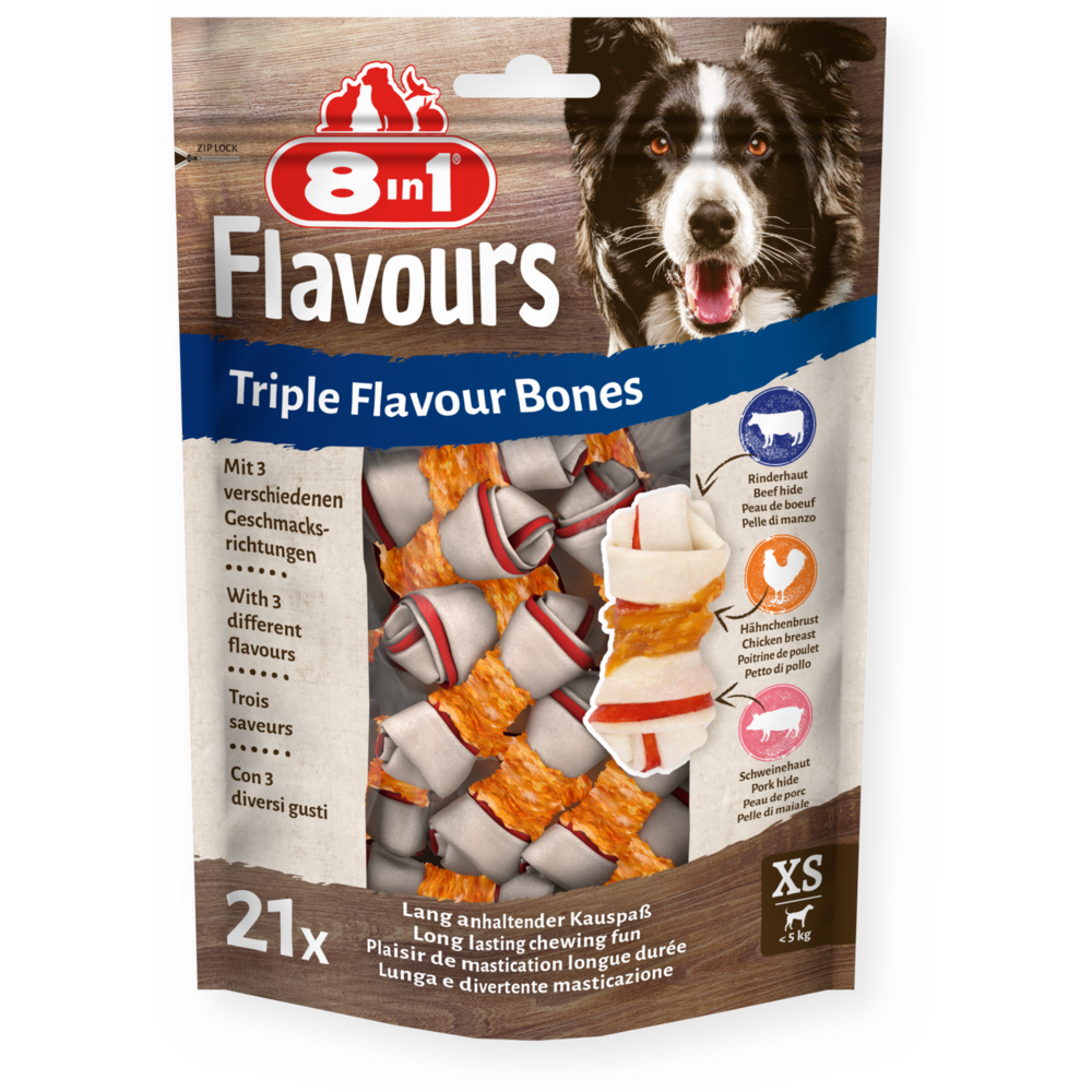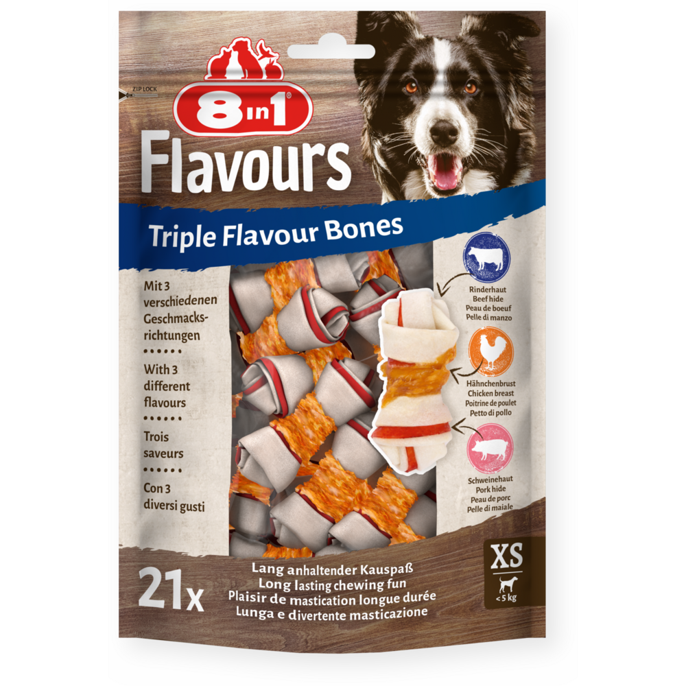 Onze ongelofelijk smakelijke 8in1 Flavours Triple Flavour Bones zijn gemaakt met stukjes kippenborst, eendenborst en kippenlever om van te watertanden. Deze worden vergezeld door een unieke combinatie varkenshuid en runderhuid om uw hond die extra smaakervaring te bieden. Deze langdurige kauwbotten helpen de opbouw van tandplak en tandsteen onder controle te houden dankzij hun natuurlijk schurende werking tijdens het kauwen. Ze zijn rijk aan eiwit, bevatten weinig vet en geen toegevoegde suikers, smaakverbeteraars of kunstmatige conserveringsmiddelen, waardoor ze de ideale beloning of snack zijn voor honden van alle soorten en maten. Bovendien bevatten ze geen ggo's en worden ze in de oven gebakken, waardoor ze niet alleen langer meegaan, maar ook alle waardevolle voedingsstoffen behouden worden. Houd uw hond tevreden en bezig met onze 8in1 Triple Flavour Bones.