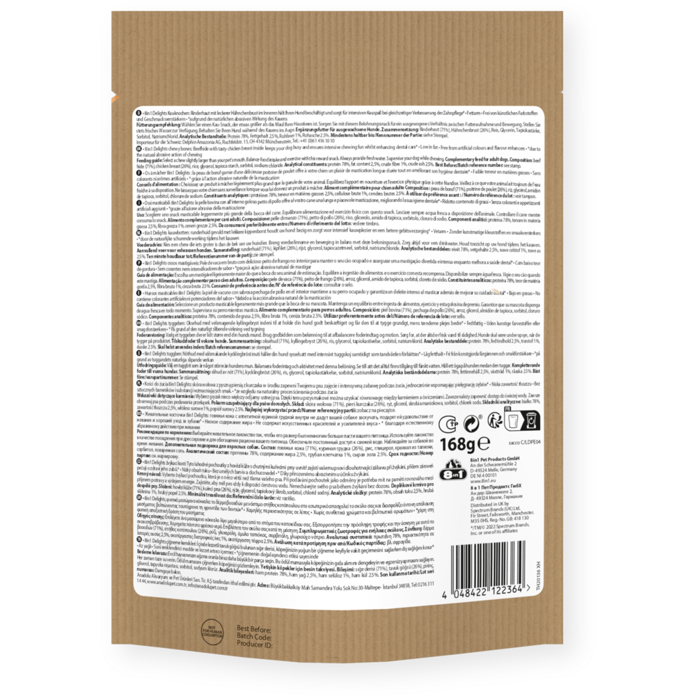 8in1 Delights Chicken Bones XS zijn gemaakt van lekkere runderhuid en heerlijke kippenborst en bieden intensief, langdurig kauwplezier voor zeer kleine honden met een gewicht van minder dan 5 kg. En terwijl de botten uw hond bezighouden, dragen ze bij aan de gebitsverzorging. Door de natuurlijke schurende werking tijdens het kauwen wordt tandsteen bij uw hond verwijderd en daarmee ondersteunen de botten de gebitsgezondheid van uw hond. De vetarme 8in1 Delights Chicken Bones XS zijn perfect als smakelijke kauwsnack om uw hond te belonen. Ze zijn rijk aan eiwitten en vrij van kunstmatige kleurstoffen en smaakversterkers. Bovendien zijn er geen suiker, ggo’s of gluten toegevoegd aan de ovengebakken kauwsnacks.