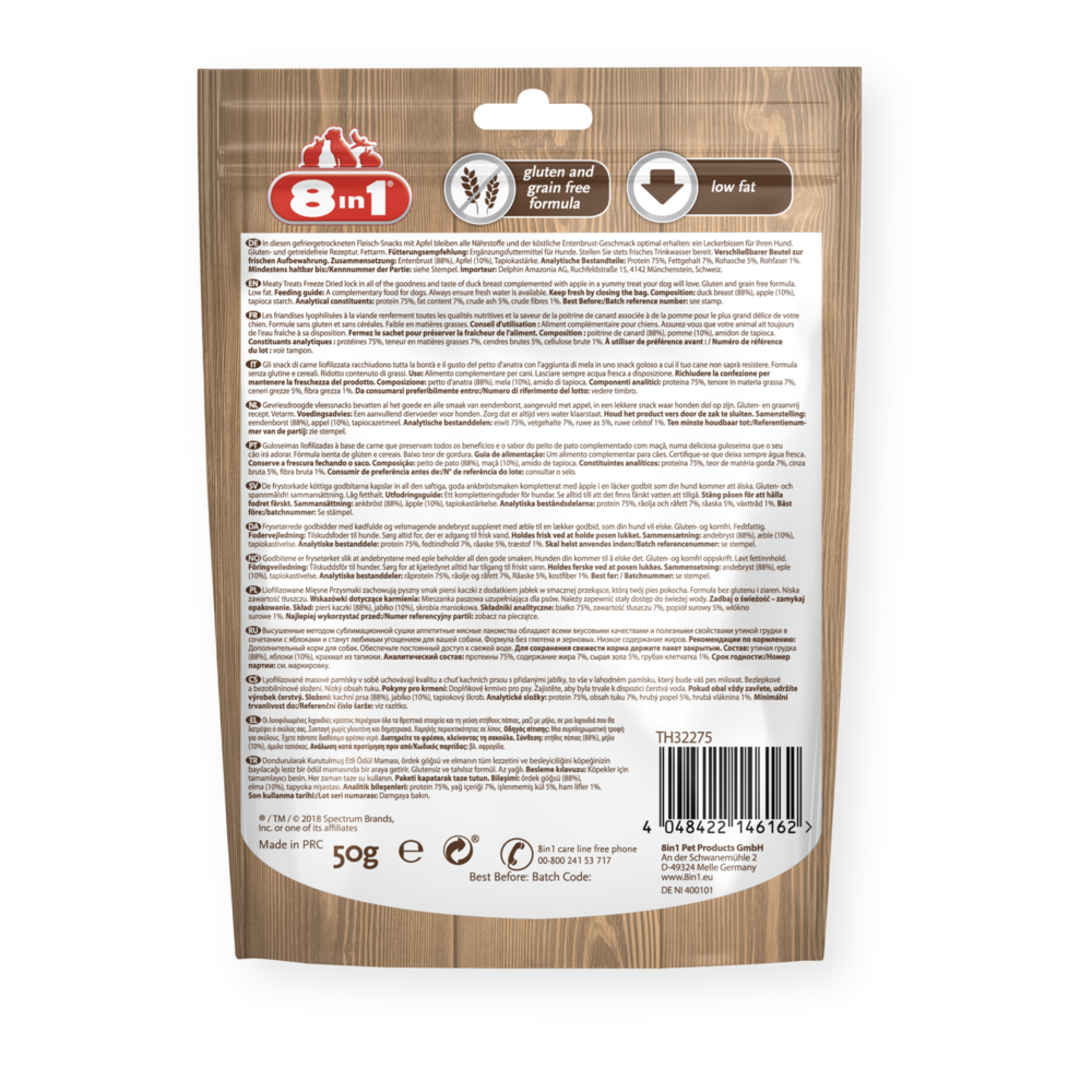 Als u een band met uw viervoeter wilt opbouwen, hem wilt belonen voor goed gedrag of gewoon omdat hij een snack verdiend heeft, pak dan een zak 8in1 Meaty Treats. Ze zijn op milde wijze gevriesdroogd om al het goede en de smaak van heerlijke eendenborstfilet en appel te behouden.